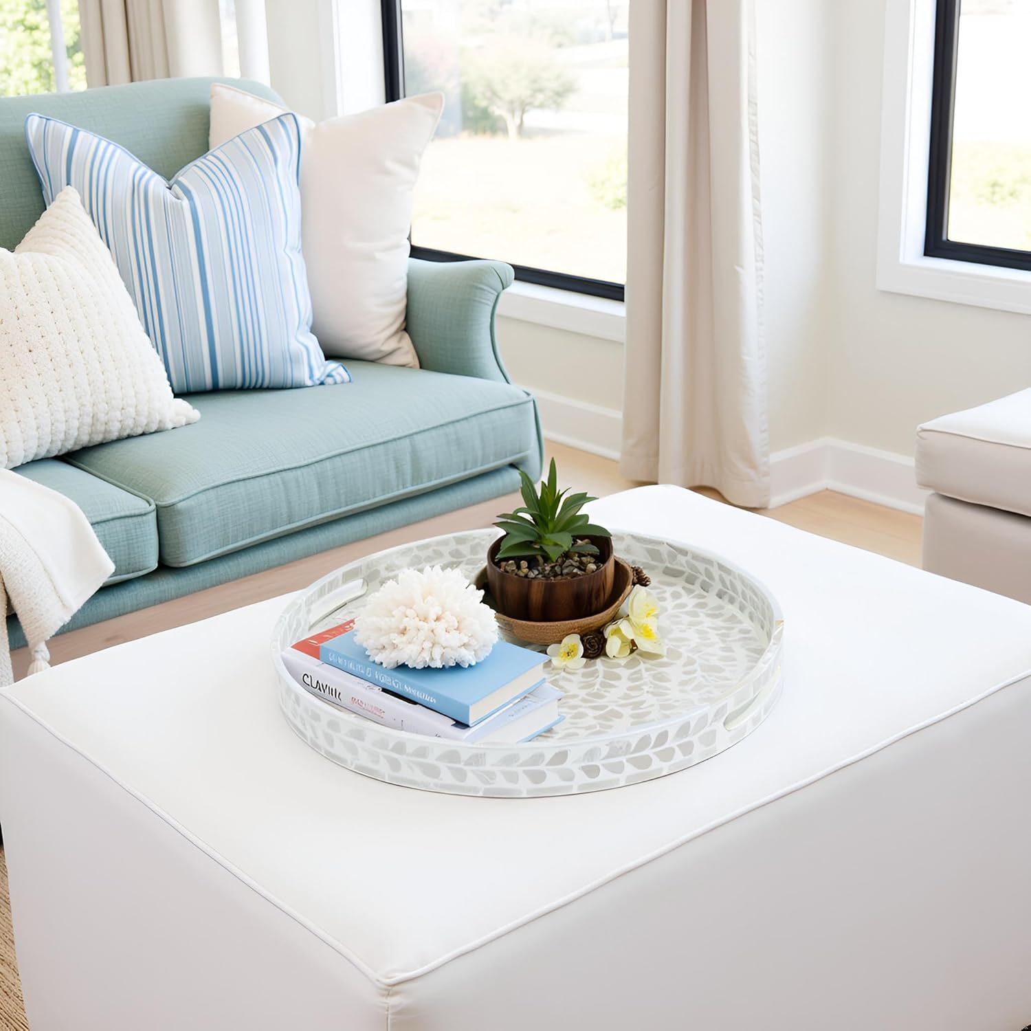 CLAYNIX Serving Tray 12.5 Inch, Lacquer Mother of Pearl Inlay Mosaic Tray, Round Wooden Marble Tray with Handles Trays for Tea, Breakfast (White)