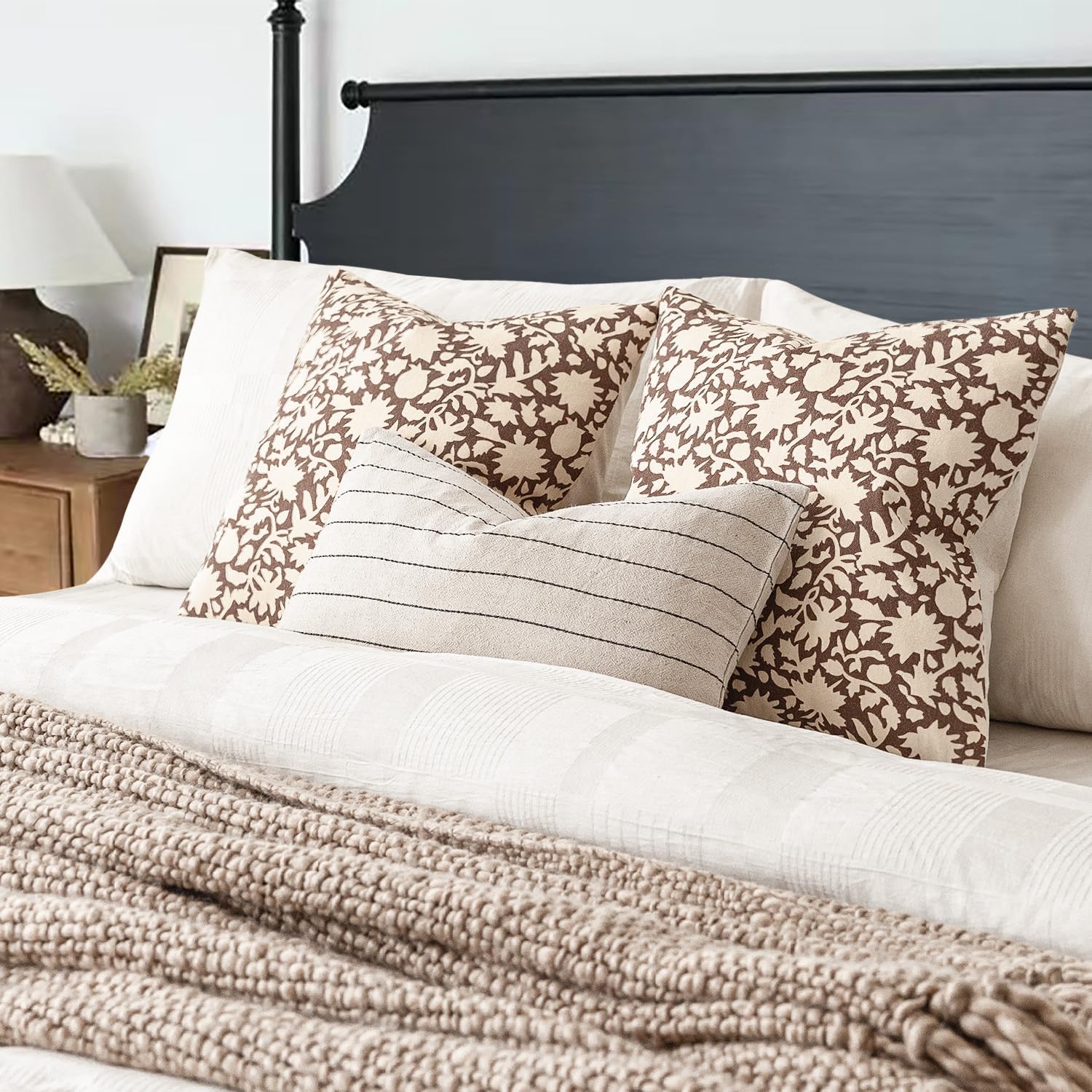 Foindtower Set of 2 Decorative Neutral Floral Throw Pillow Covers Accent Farmhouse Cushion Covers Boho Vintage Pillowcase for Couch Sofa Bedroom Living Room Home Decor Outdoor,22×22 Inch,Brown