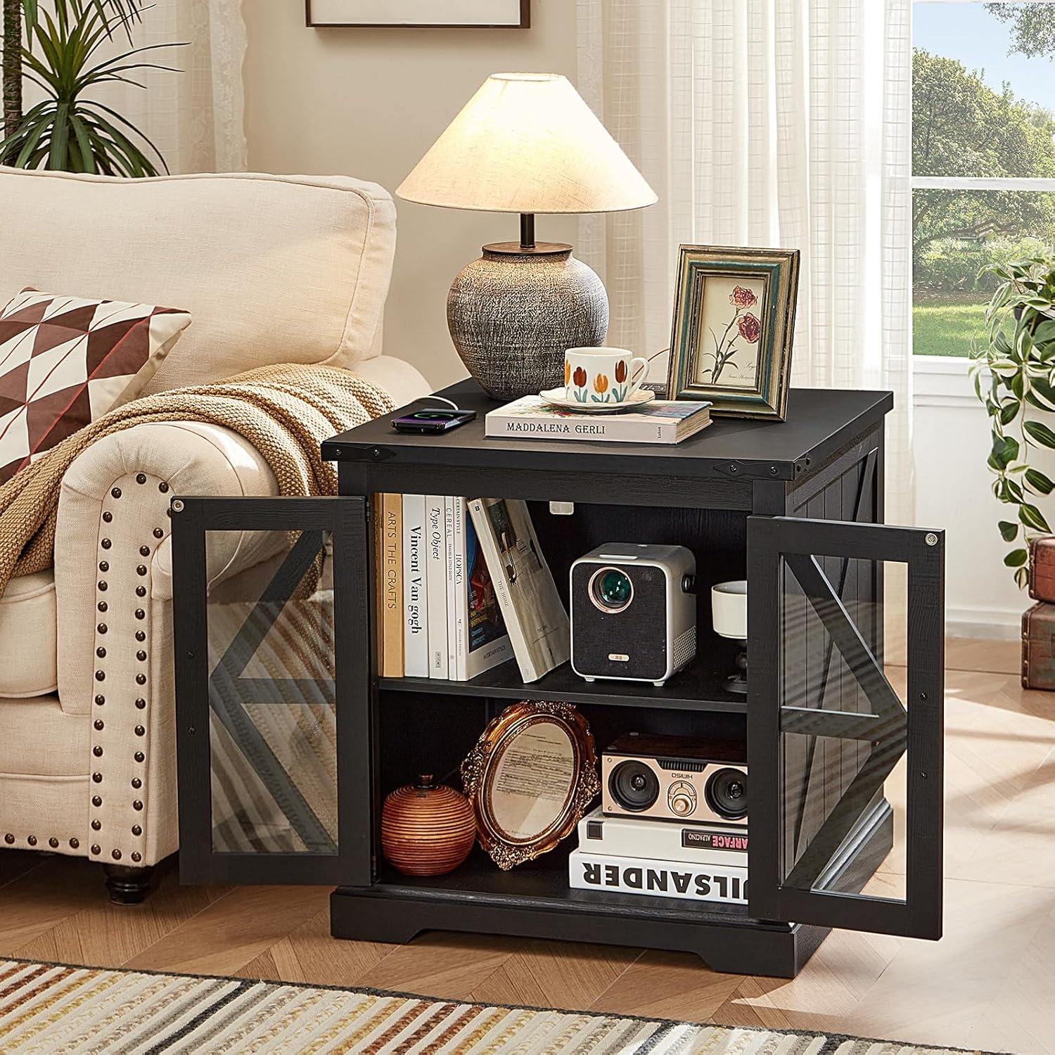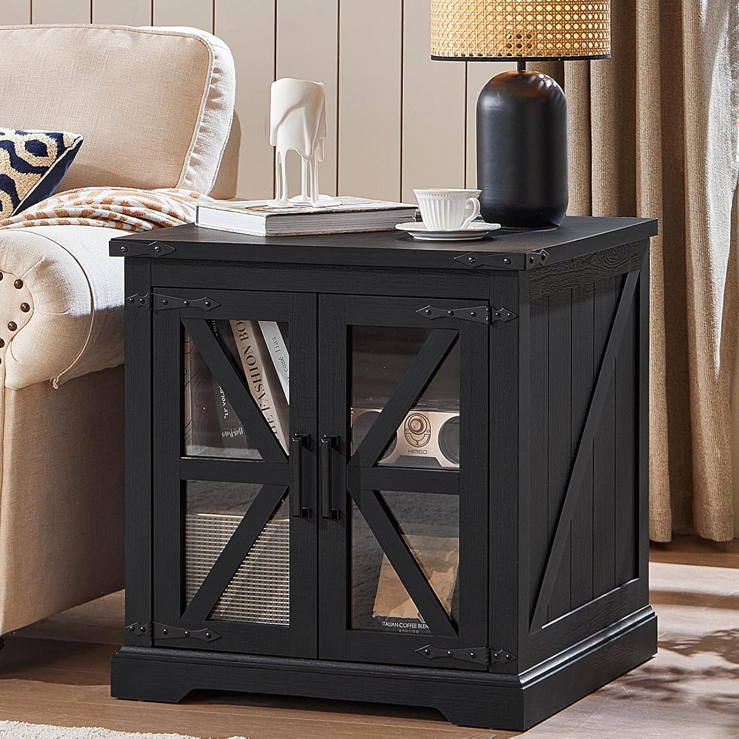 - π‘[Functional Art Piece]The oversized end tables living room storage design provides convenient storage for your living space. The built-in shelves can be adjusted to 3 different heights as per your needs, accommodating an abundance of books, blankets, or coffee mugs. The glass barn-style doors blend traditional farmhouse aesthetics with a modern sensibility, transforming this piece into a more contemporary farmhouse night stand, coffee table, bedside table, or side-of-sofa art.