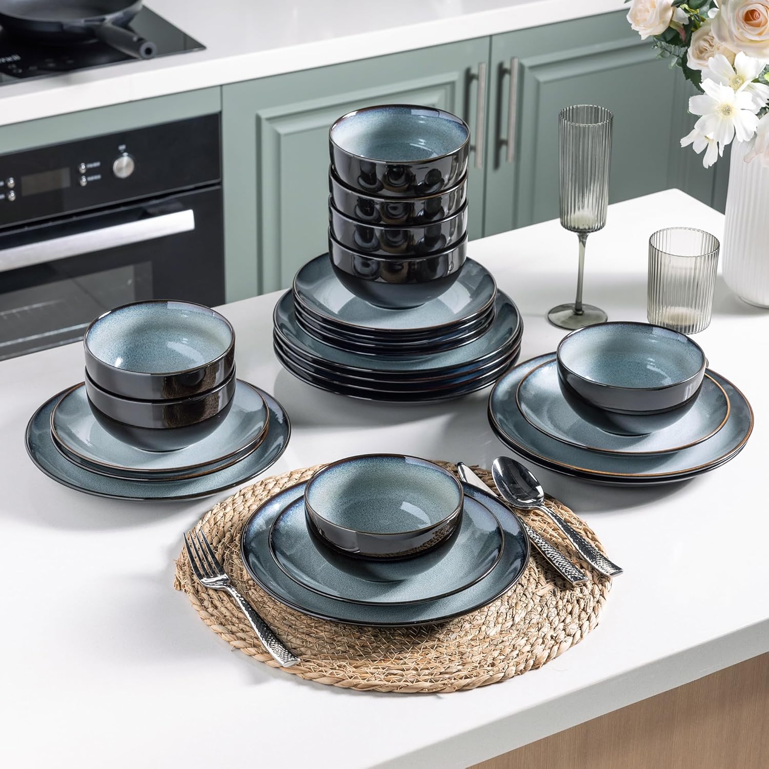 - 【 ELEGANT AND STYLISH DESIGN】This dinnerware set, with its vibrant colors and unique surface treatment, leads the dining trend. With a lively color palette and captivating surface treatment, it creates a warm and enchanting atmosphere. The eye-catching reactive glazes and rich, vivid hues not only soothe the senses but also enhance your dining experience. Another distinctive feature of our product is its ability to be placed in the oven, providing you with more cooking possibilities.