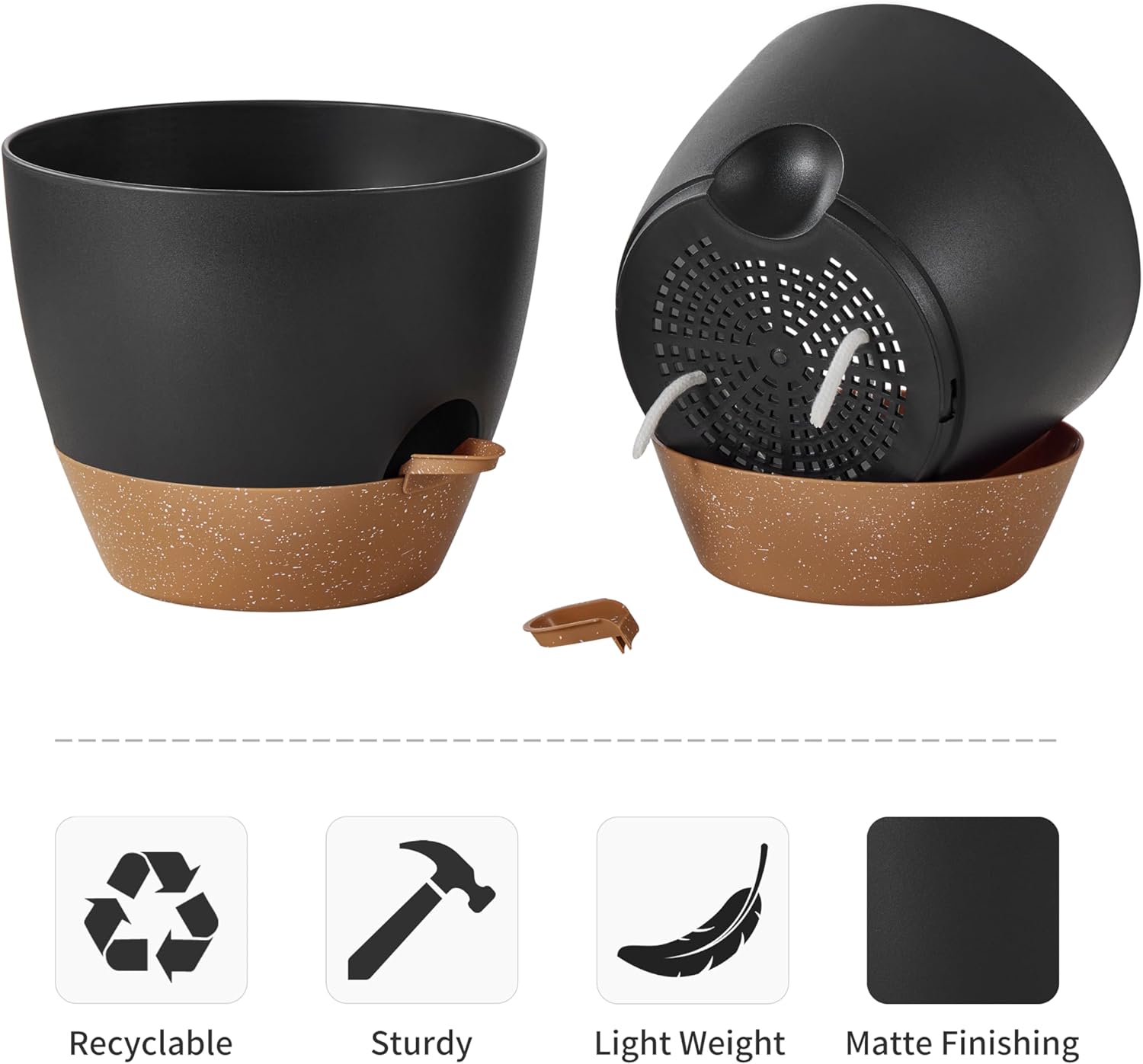 FaithLand 3-Pack Large Planter Pots, 12 10 9 Inch Self Watering Flower Pots for Indoor Outdoor Garden Plants, Black with Brown