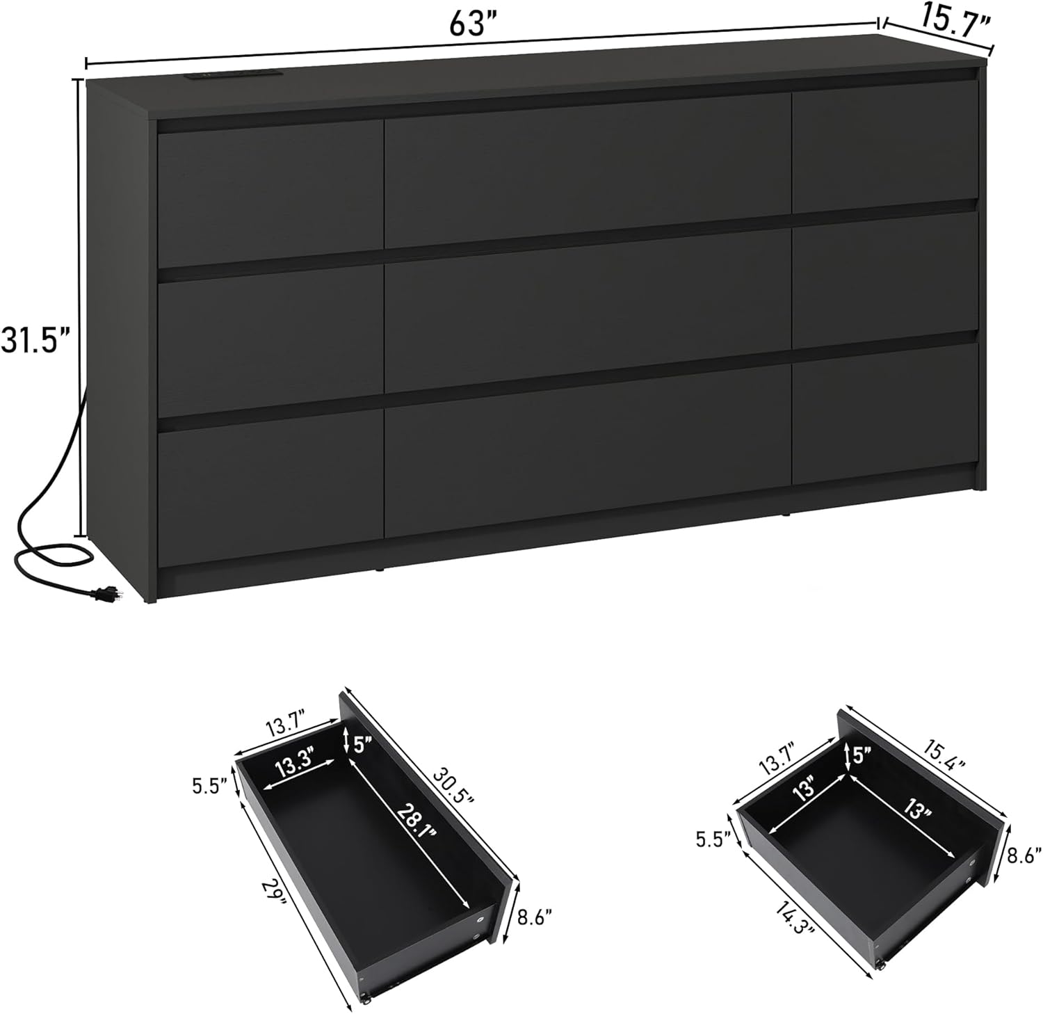 - 【Black Dresser with Power Outlets】 Unlike other large wooden 9 drawers malm dresser, our bedroom dresser comes with a quick charging station that includes 2 outlets, 2 USB ports, and a fast-charging port to quickly full charge your cell phone, tablet, and other electronic devices, which is very convenient for our life.
