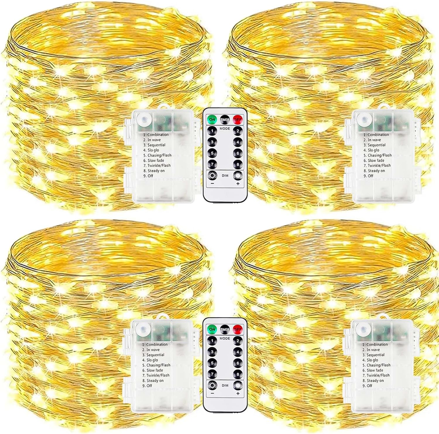 - Upgraded Christmas twinkle lights: Designed with ultra-bright LEDs and durable silver wire, these battery fairy lights are built to last and make an excellent choice for decorating bedrooms, centerpieces, balconies, and porches. Each set includes 4 strands of lights and 2 remotes, each 33ft long with 100 LEDs, powered by 3 AA batteries (not included)