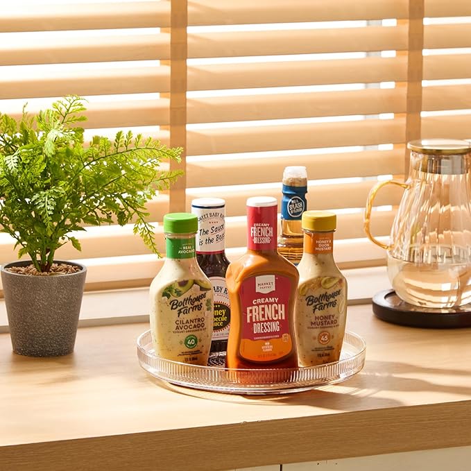 - 360°ROTATABLE EASY TO REACH: The Lazy Susan rotates 360 degrees smoothly and silently, eliminating the hassle of reaching into deep cabinets. The slick rim prevents items from sliding off while it spins, and the clear circular design with clear sides for easy viewing.