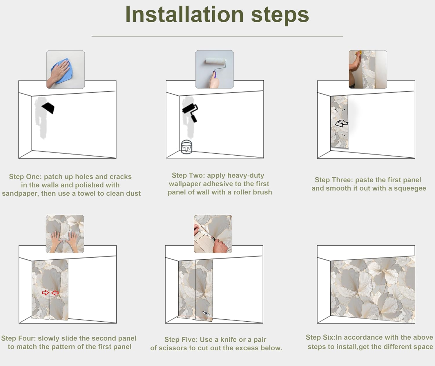 - INSTALLATION - 1.Fill in all cracks or holes and clean dust dirt and grease on the wall surface. 2. Apply the heavy duty wallpaper paste on the wall not mural. 3. Use a spirit level to mark first strip location. 4. match the pattern by sliding into place. 5.use a scraper to smooth out bubbles press. 6. Let dry for a few minutes and that's it! Please Note: Not self-adhesive. We recommend to use a standardized fleece wallpaper paste.