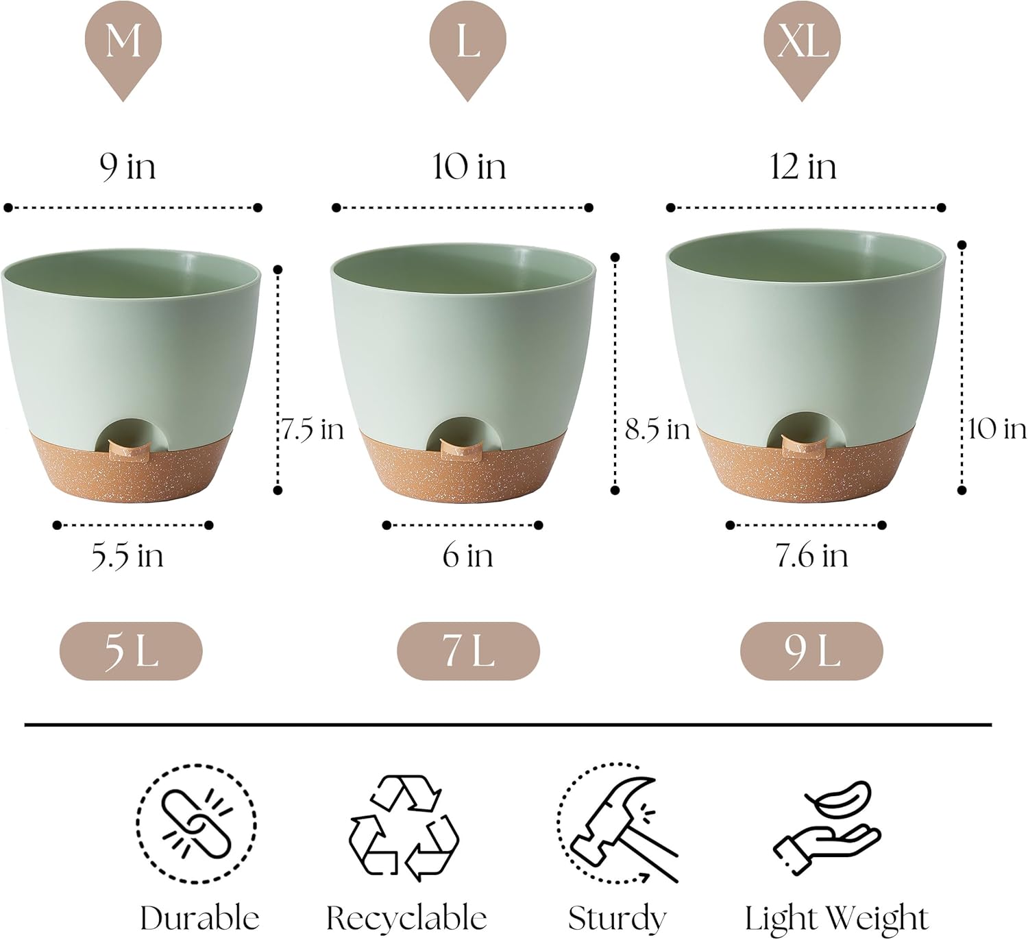 Giraffe Creation Plant Pots Set of 3 (12/10/9 inch), Self-Watering Indoor & Outdoor Flower Planters with Drainage Hole and Reservoir, Green