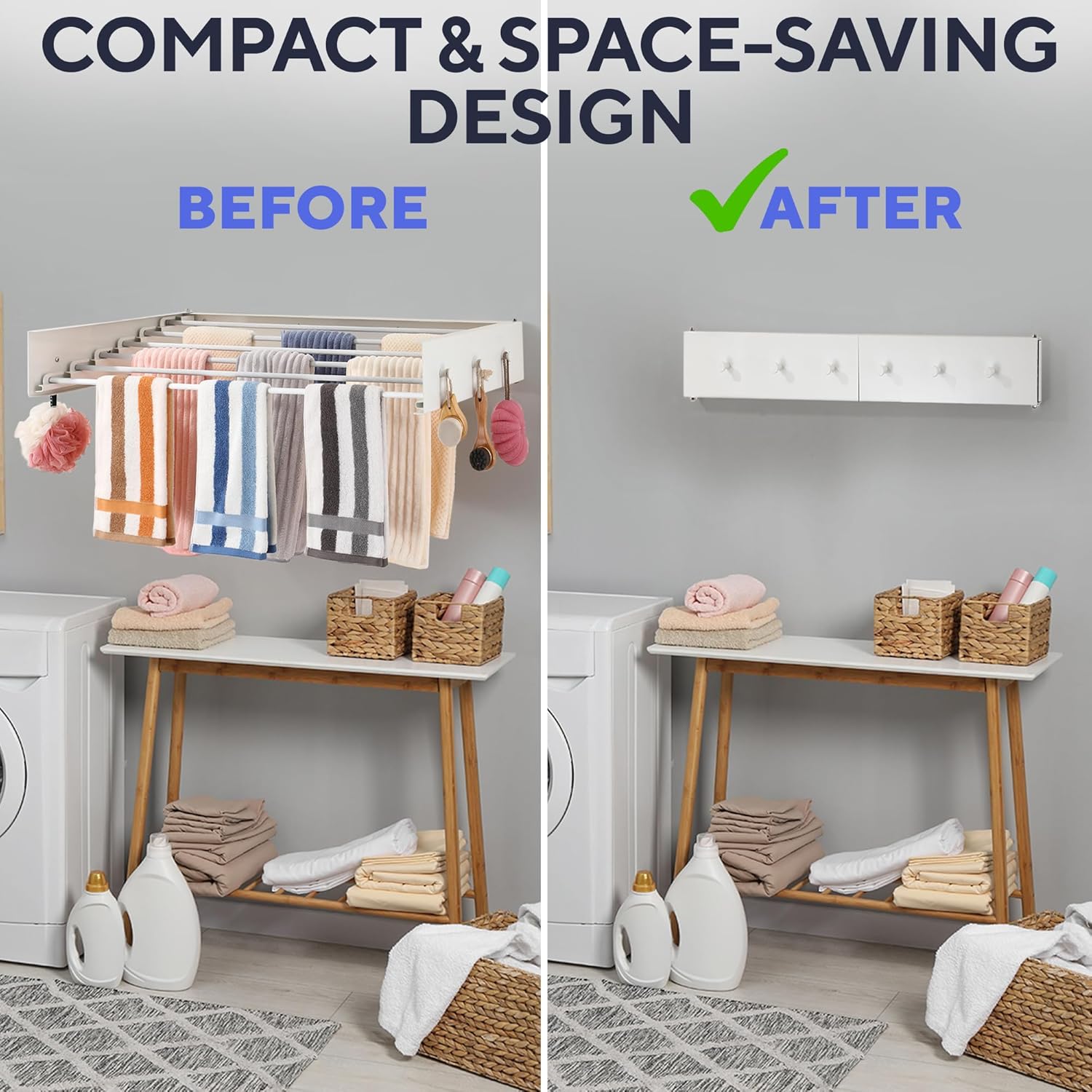 - Save Space & Maintain Elegance β Elevate your laundry area with a sleek, modern drying rack that folds to just 1 inch against the wall. Featuring 6 elegant hooks, it combines practicality with refined style, seamlessly complementing any decor while saving precious floor space.