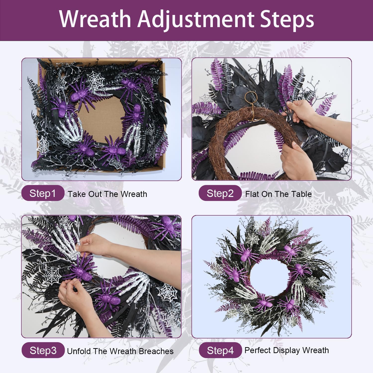 - π Festive Halloween Wreath: Celebrate Halloween with this 20-inch wreath adorned with black & purple leaves, purple Spiders Silver Skeleton Hands, creating a gothic and spooky ambiance.