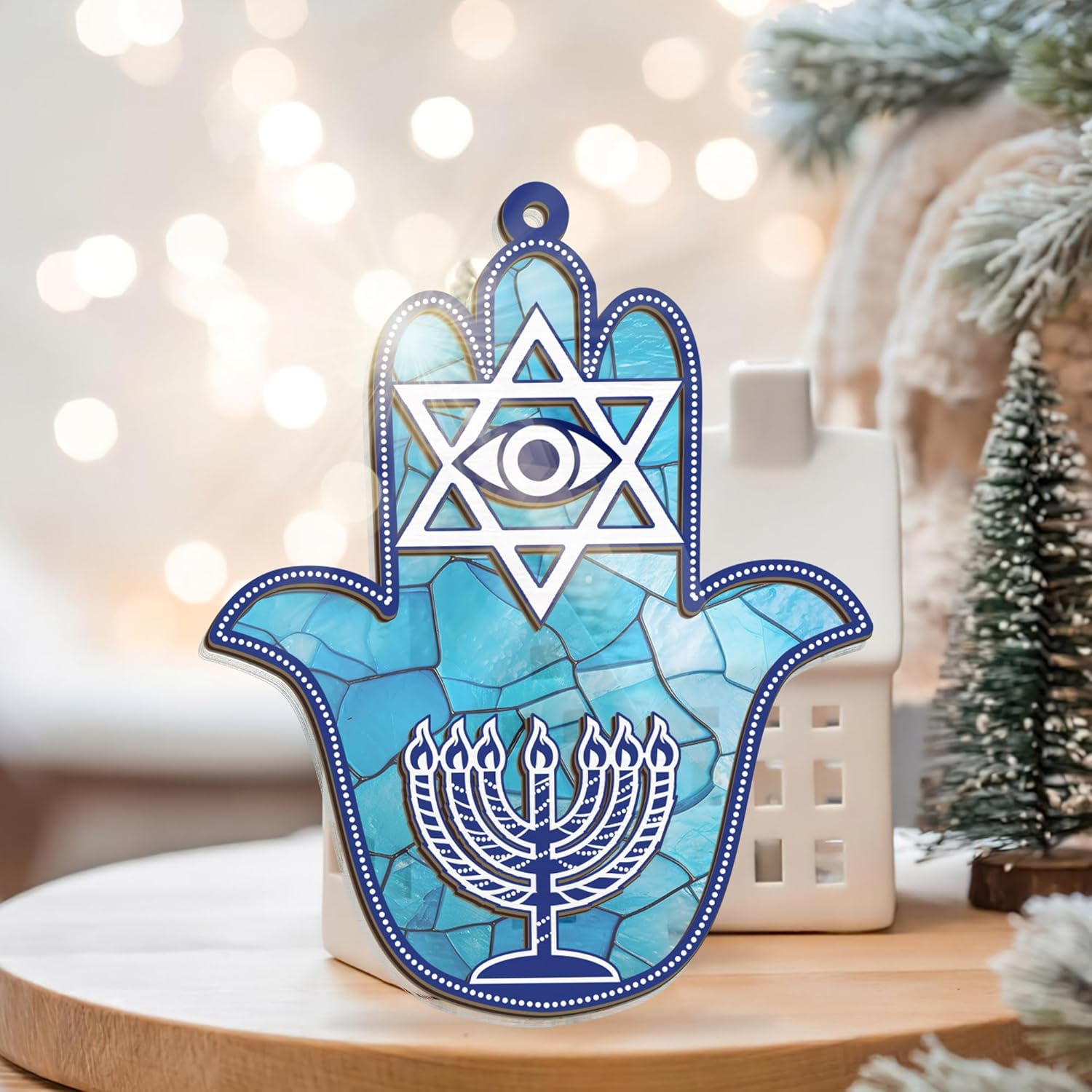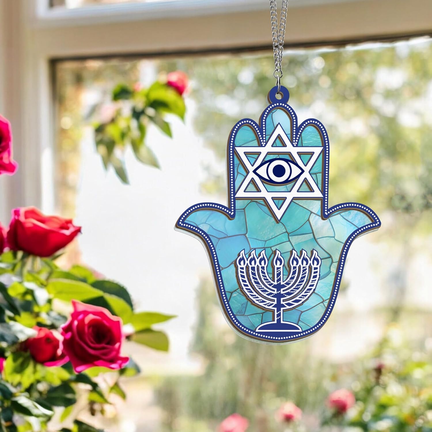 - HANUKKAH GIFTS FOR WOMEN, MEN β Celebrate the profound symbolism of the Hamsa protection amulet with our exquisite suncatchers for windows hanging. Adorned with the Star of David and Blue Evil Eye design, these house warming gifts for men, women, good luck gifts for mom, friends bring a serene touch to your Hanukkah and Jewish spirit to your room, wall decor.