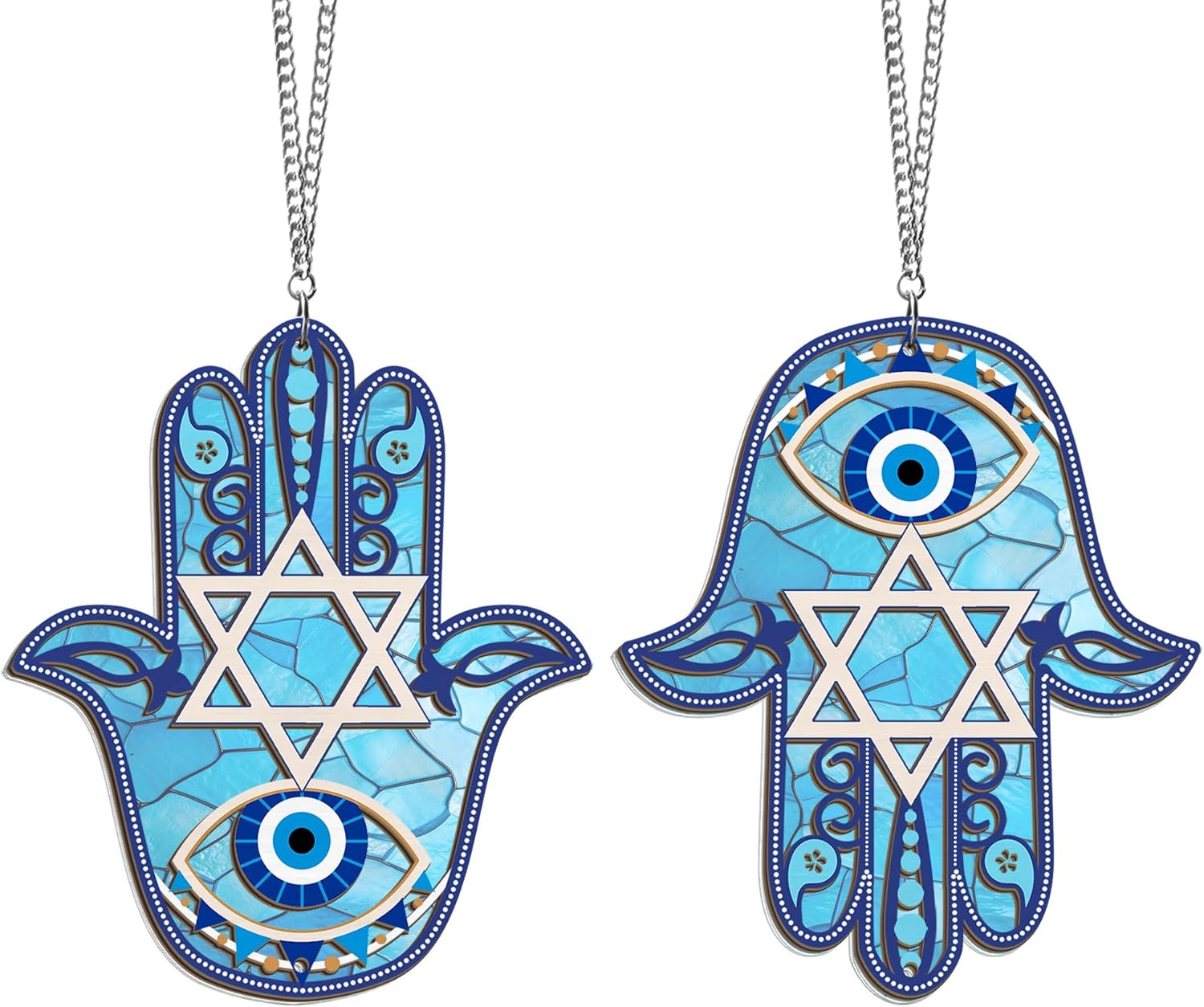 - CAPTURE LIGHT BEAUTIFULLY - Transform your space with light and color. Our suncatcher hanging features two unique hanging designs, not a pack of two but you can choose between two beautiful sides to cast a radiant light display: one featuring a Star of David for blessing and the other showcasing protection against Evil Eyes.