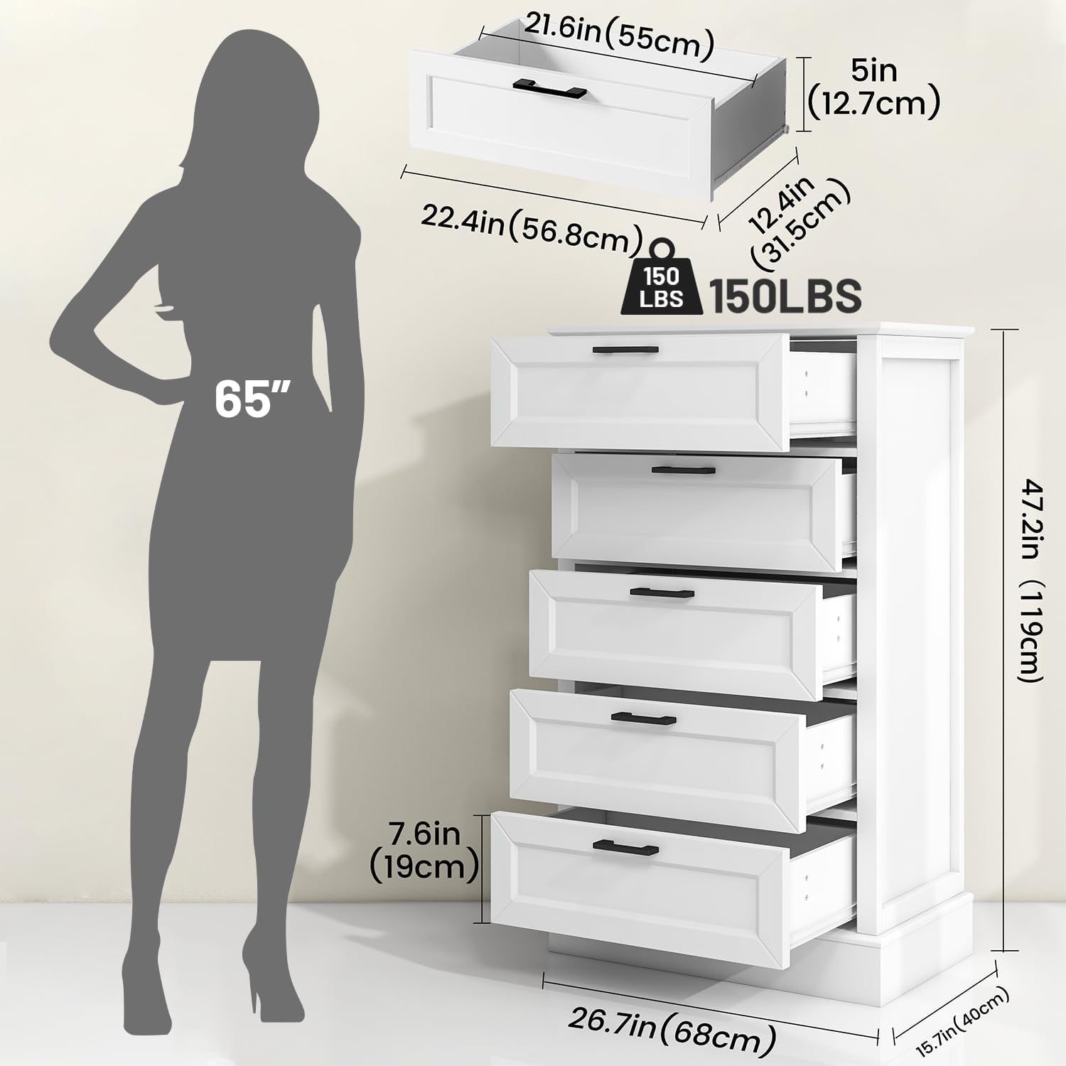 White Dresser for Bedroom, Wood Dresser with 5 Drawers, Chest of Drawer for Bedroom Living Room Entryway Hallway, Modern Farmhouse Style Black Handles 47" Tall