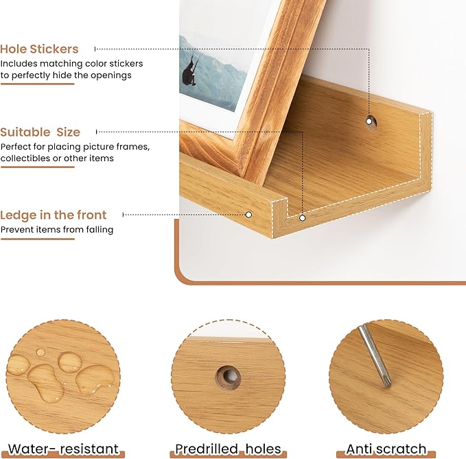 - Enhanced Stability Design: Featuring a secure lip at the front, these floating shelves prevent items from slipping or falling, confidently supporting up to 42 lbs, making these MDF wood shelves ideal for showcasing cherished items.