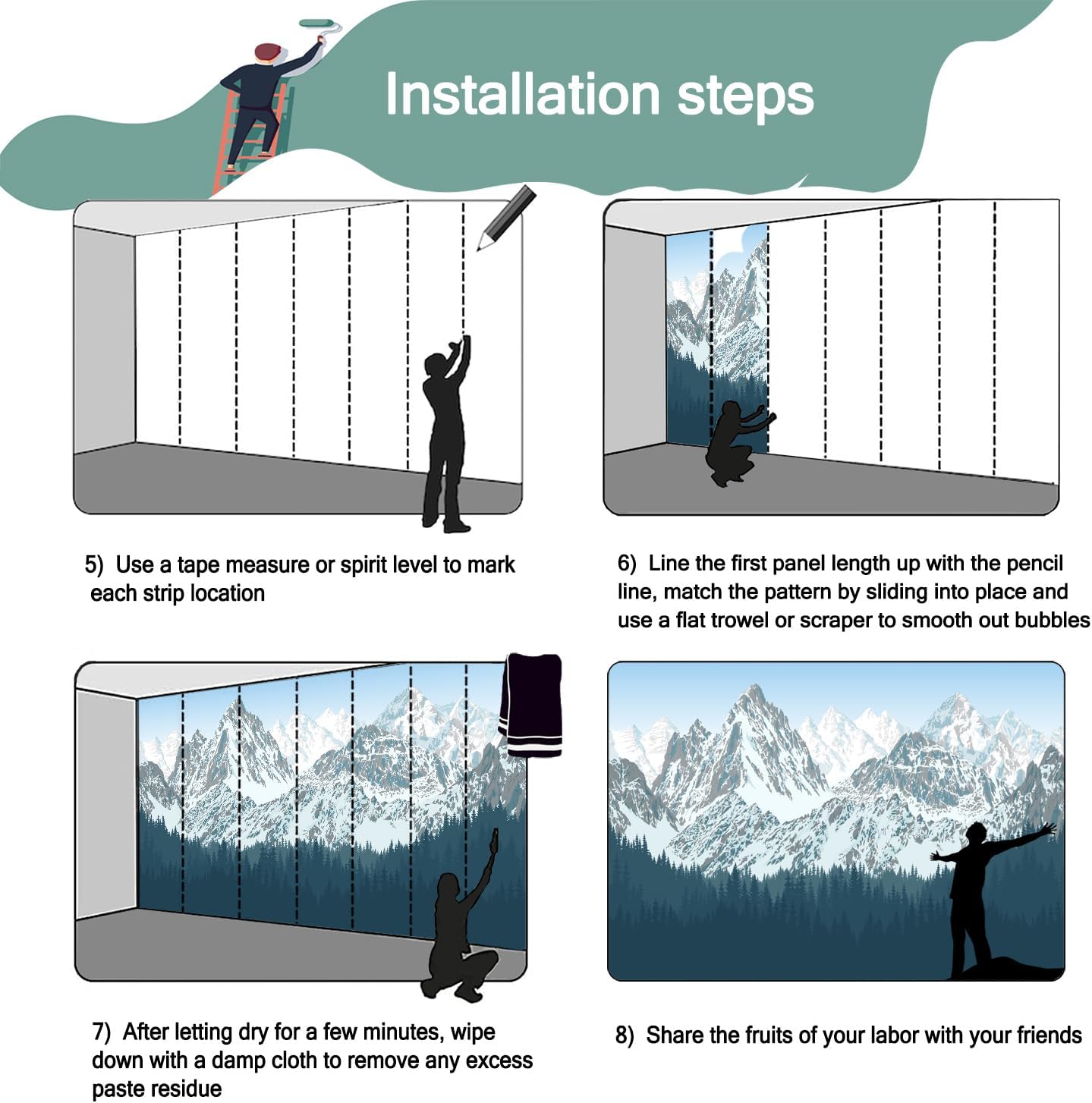 - Mural wallpaper size: 100 "W x 65 "H, divided into 5 sections, each section is labeled with a number underneath, there is no need to overlap the pattern when installing, just install according to the number labeled underneath the panel