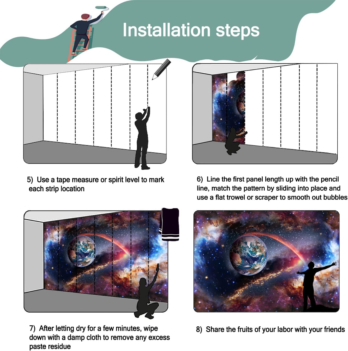 - Mural wallpaper size: 100 "W x 65 "H, divided into 5 sections, each section is labeled with a number underneath, there is no need to overlap the pattern when installing, just install according to the number labeled underneath the panel