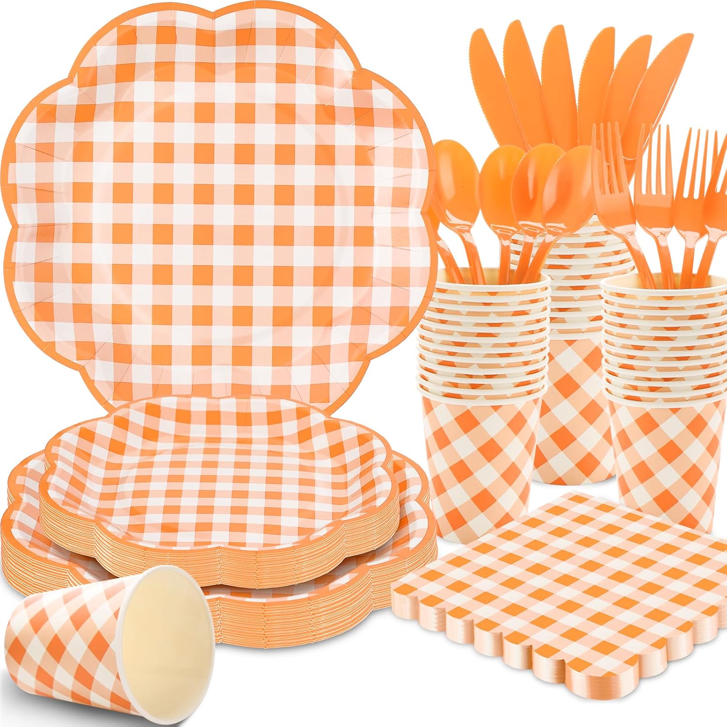 - 【Serves 25 Guests】Orange gingham party supplies includes 25pcs 9-inch orange checkered dinner plates, 25pcs 7-inch orange plaid dessert plates, 25pcs 9 oz gingham cups, 25pcs 6.5-inch orange gingham napkins, and 25 sets of knives, forks, spoons for a total of 175 pieces. Perfect for all kinds of parties and celebrations