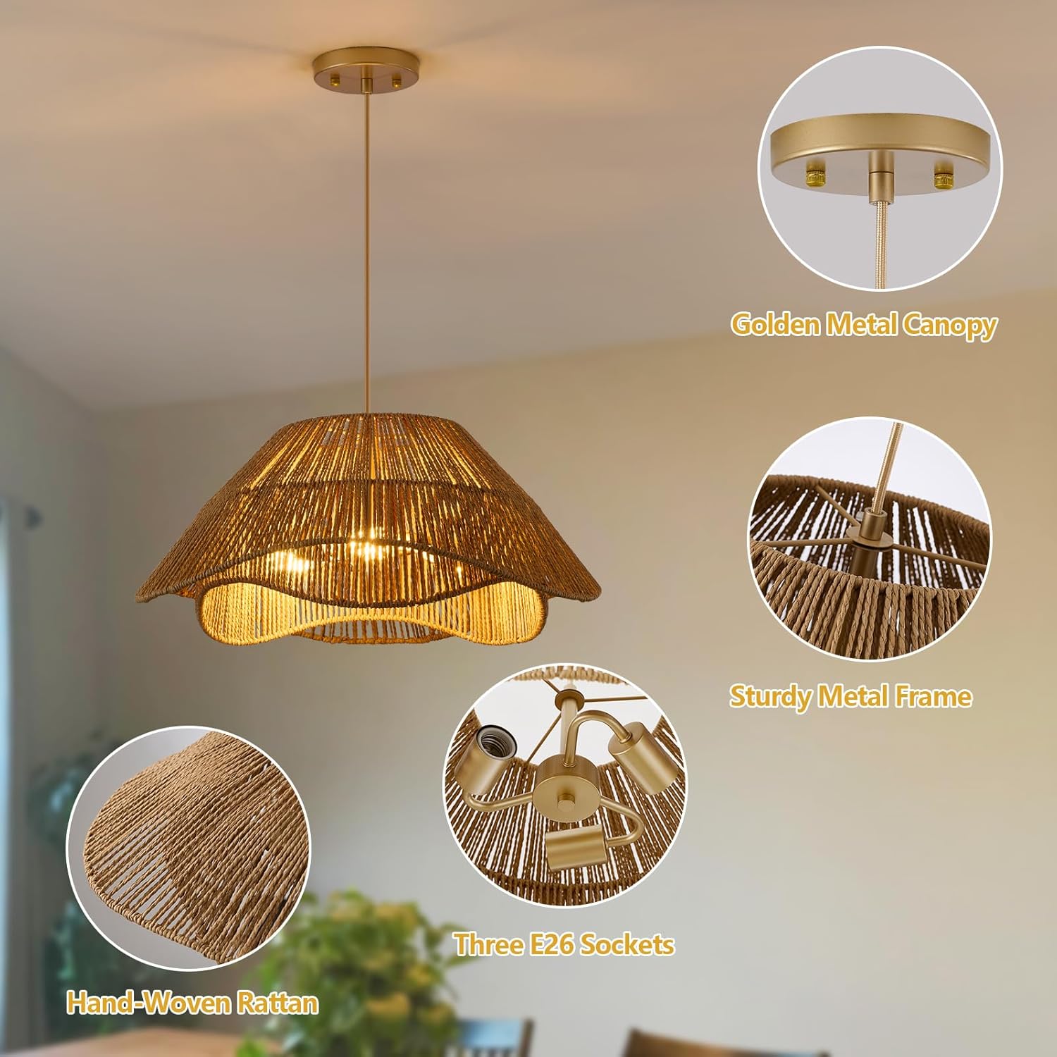 19.68" Large Gold Rattan Pendant Light, 3-Light Farmhouse Chandeliers for Dining Room, Woven Wicker Flush Mount Hanging Light, Adjustable Boho Pendant Lighting for Kitchen Island Bedroom