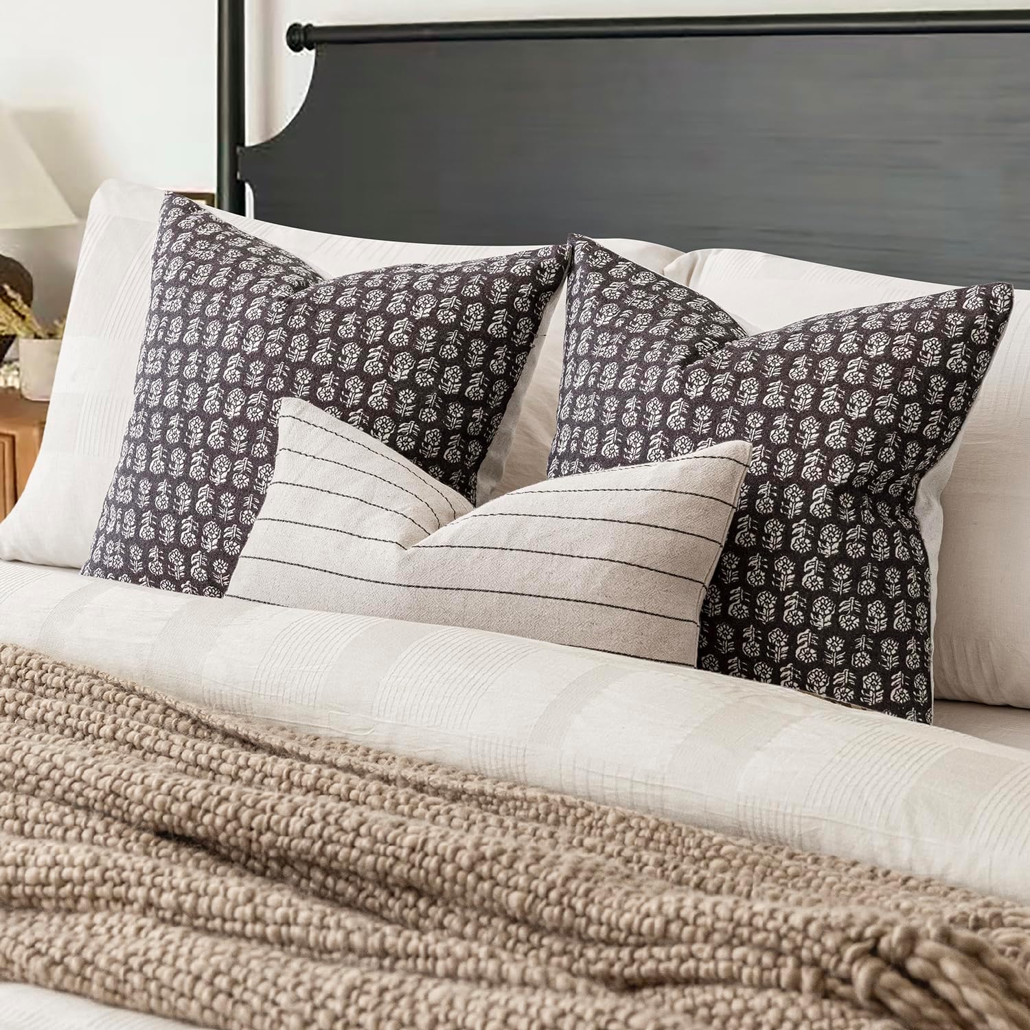 Foindtower Set of 2 Decorative Neutral Floral Print Throw Pillow Covers Vintage Accent Farmhouse Cushion Covers Boho Home Decor for Sofa Couch Chair Bedroom Living Room Outdoor,22×22 Inch,Black