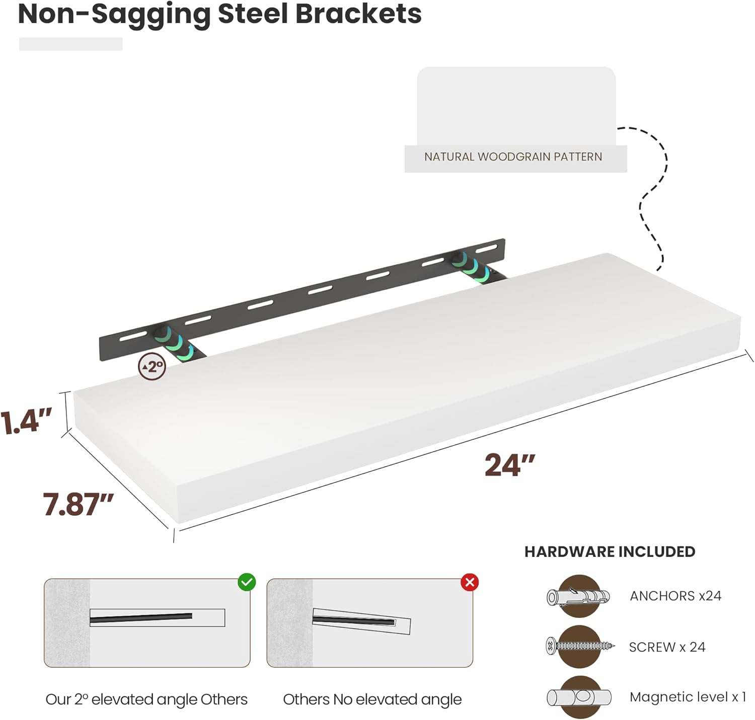- Premium Wooden Floating Shelves -Unlike others, they are beautifully-finished, fantastic-smelling solid pine,and they are handcrafted out of finest solid pine wood measuring 24" x 8" x 1.38",revealing its own character of knots and natural wood grain, making each ledge a little different but equally stunning.