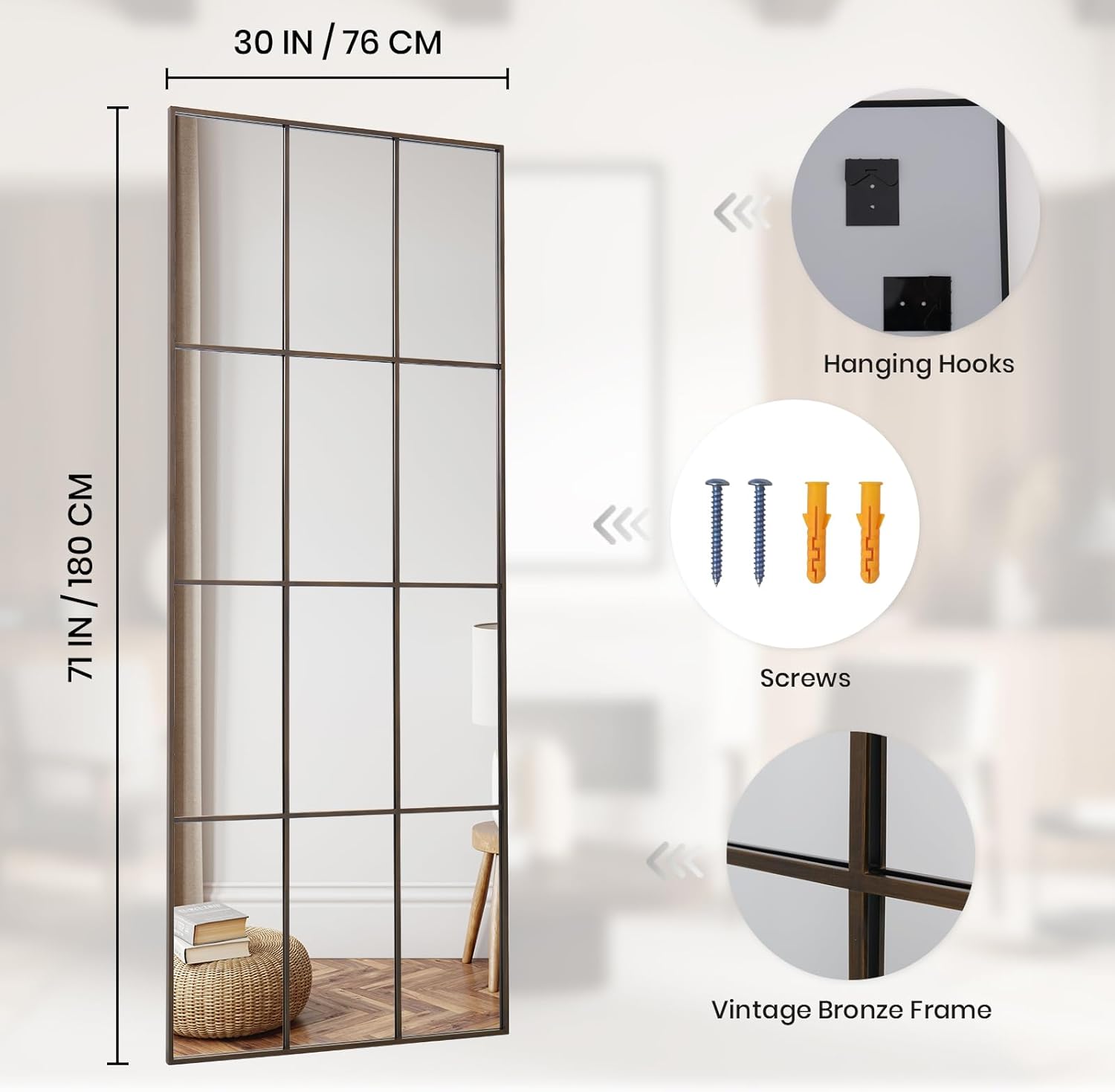 Windowpane Mirror Full Length 71"x30" Wall Mounted Mirror Faded Bronze Frame Vintage Distressed Art Pane Leaning Hanging Wall for Home Decor in Living Room Bedroom Hallway Entrance