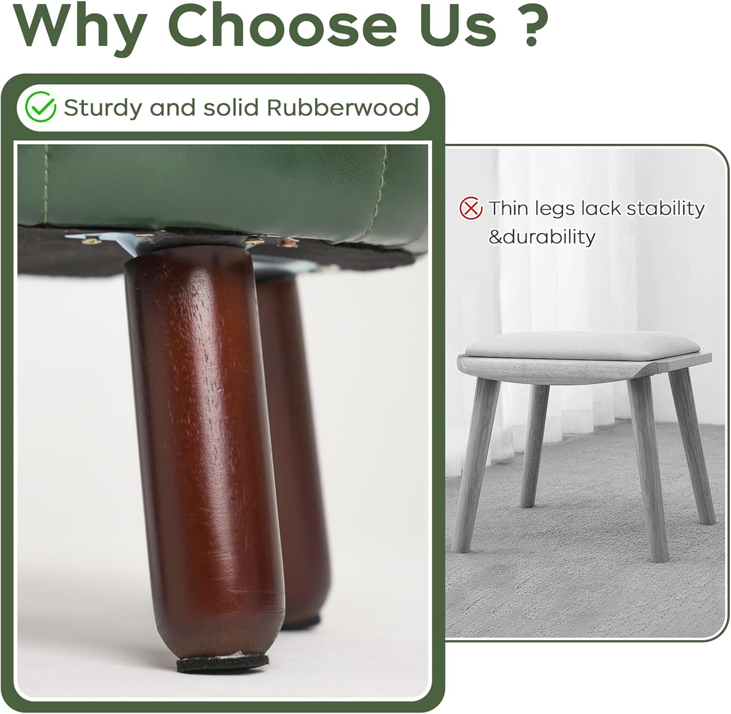 - 【Anti-Slip Design】- These faux leather foot stools small ottoman rubber legs come with dedicated felt pads to prevent scratches on floor and keep it from sliding.Wood leg with non-slip felt pad is quiet when moving, and can avoid leaving scratches on floor.The small footstool is perfect for small spaces and is compact enough not to get in anyone's way.