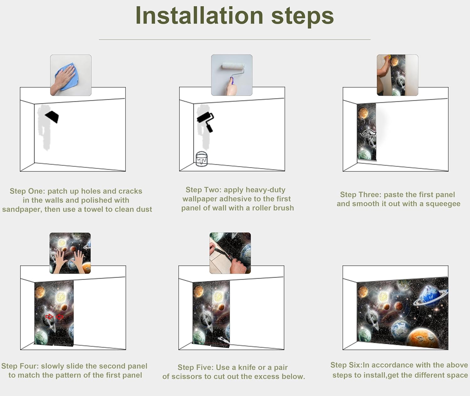- INSTALLATION - 1.Fill in all cracks or holes and clean dust dirt and grease on the wall surface. 2. Apply the heavy duty wallpaper paste on the wall not mural. 3. Use a spirit level to mark first strip location. 4. match the pattern by sliding into place. 5.use a scraper to smooth out bubbles press. 6. Let dry for a few minutes and that's it! Please Note: Not self-adhesive. We recommend to use a standardized fleece wallpaper paste.