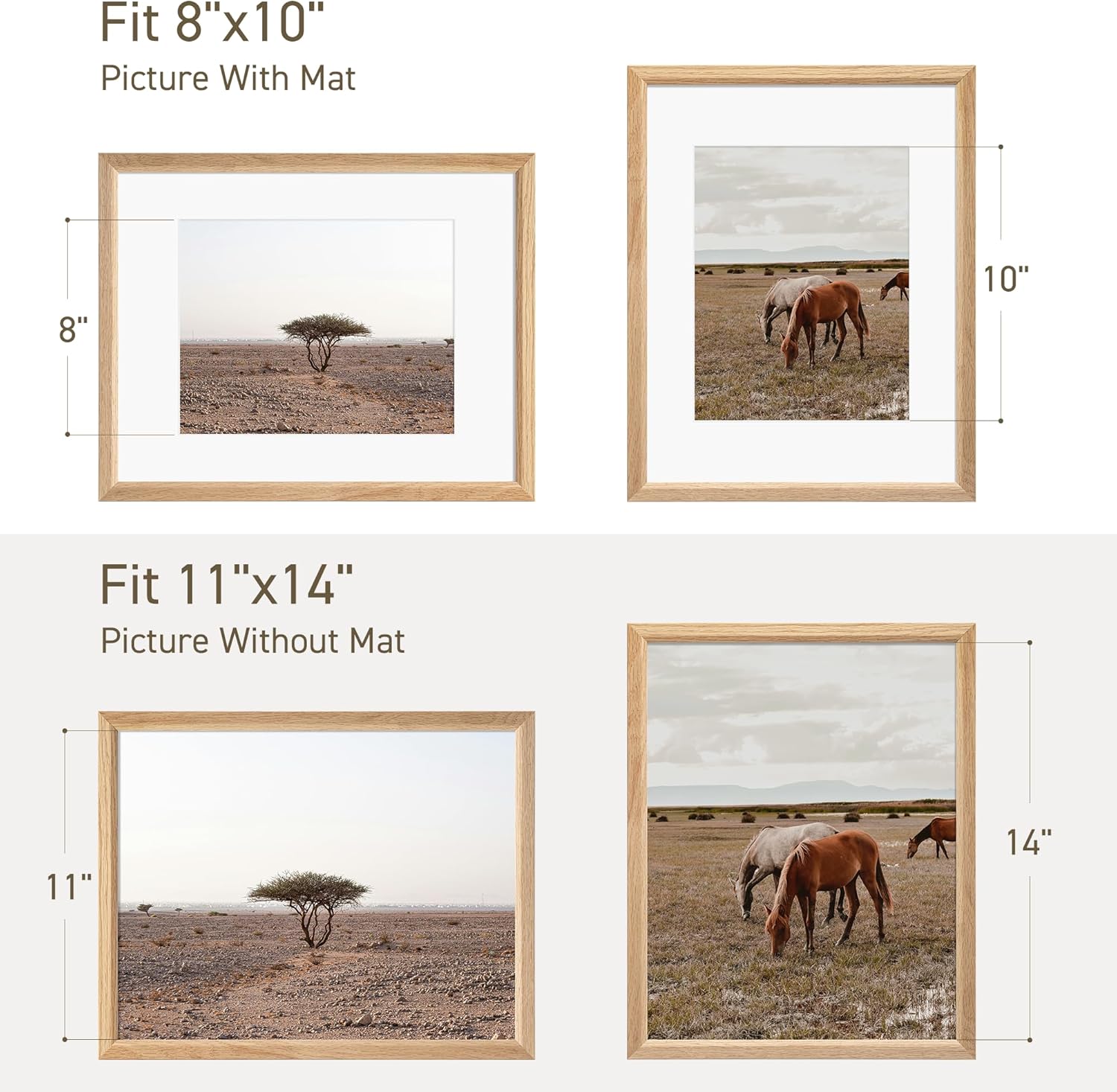 11x14 Picture Frame Set of 4 Natural Solid Oak Photo Frames with 8x10 Removable Mat Wall Hanging Large Handcrafted Frame with HD Plexiglass Wall and Tabletop Display Large Poster Frame