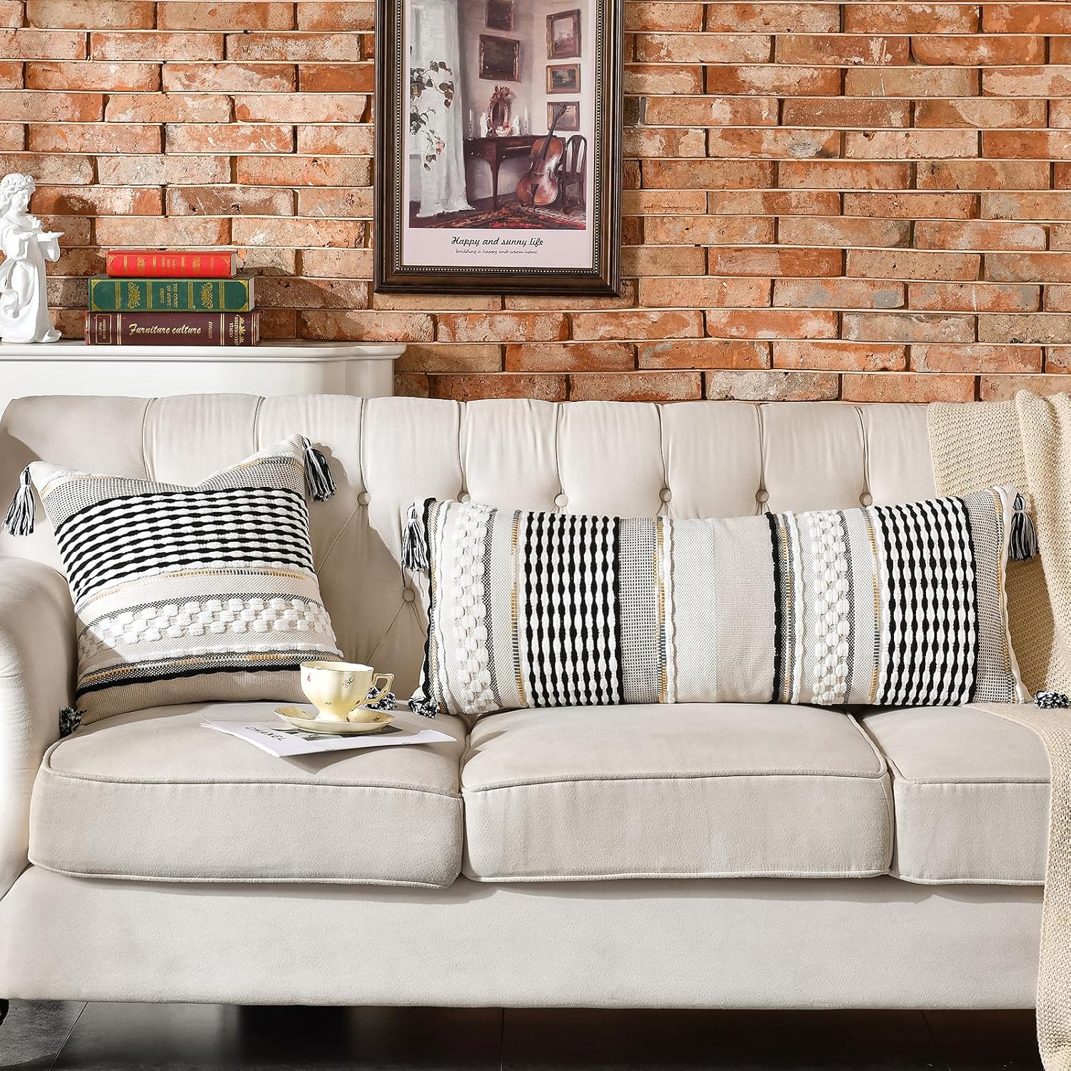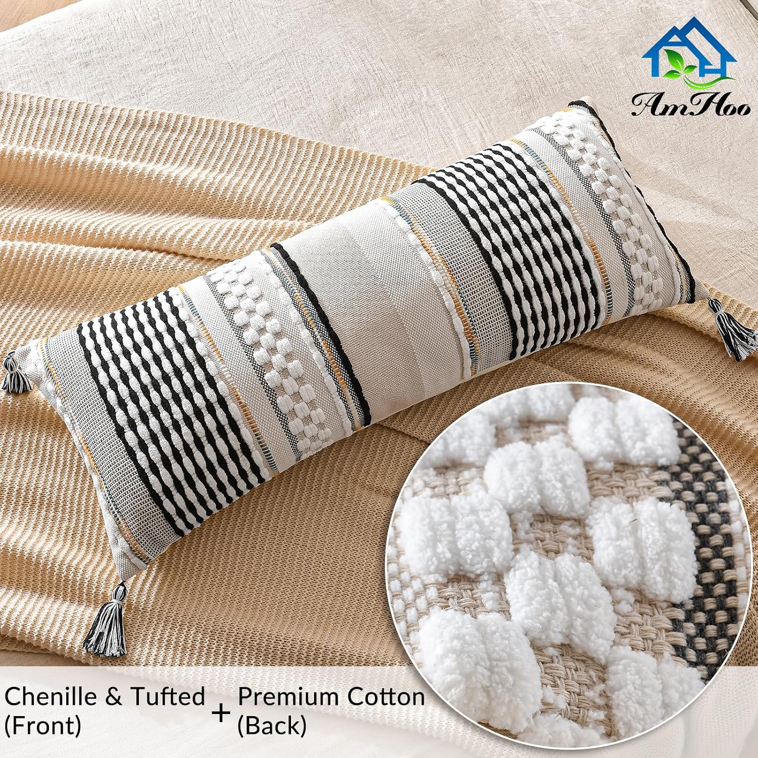 AmHoo Chenille Striped Textured Boho Throw Pillow Covers Aesthetic with Tassels Woven Decorative Pillow Case for Couch Bed Sofa Bedroom Modern Funky 14 x 36-Inch Black