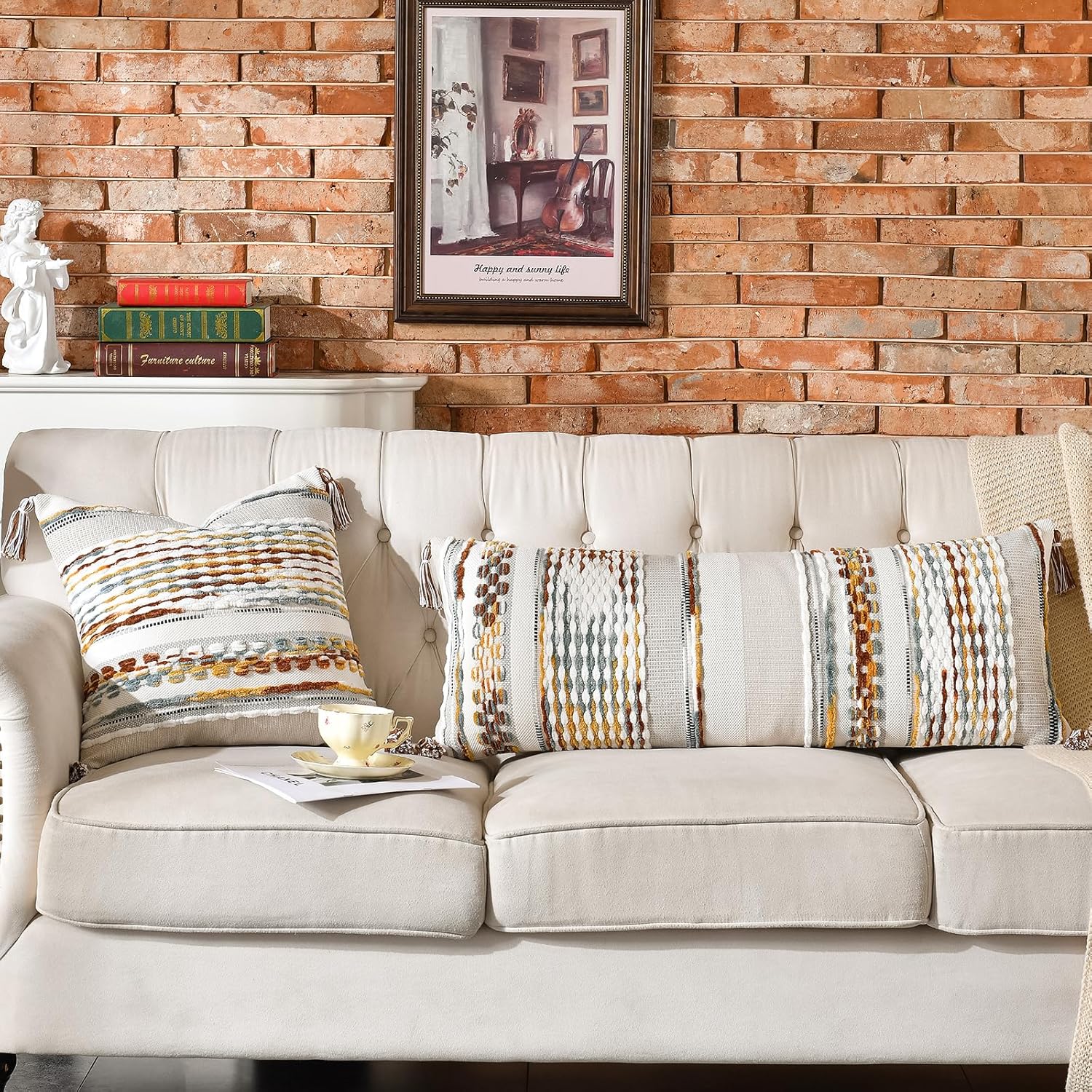 AmHoo Chenille Striped Textured Boho Throw Pillow Covers Aesthetic with Tassels Woven Decorative Pillow Case for Couch Bed Sofa Bedroom Modern Funky 14 x 36-Inch Brown