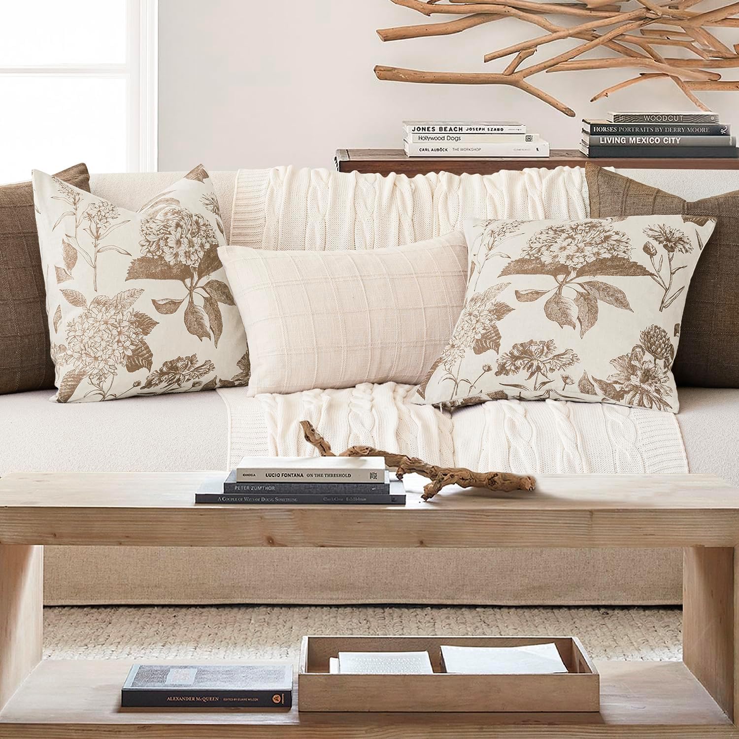 Foindtower Set of 2 Linen Floral Throw Pillow Covers Neutral Vintage Print Decorative Cushion Covers Farmhouse Boho Home Decor for Sofa Chair Couch Bedroom Living Room Outdoor,22×22 Inch,Light Brown