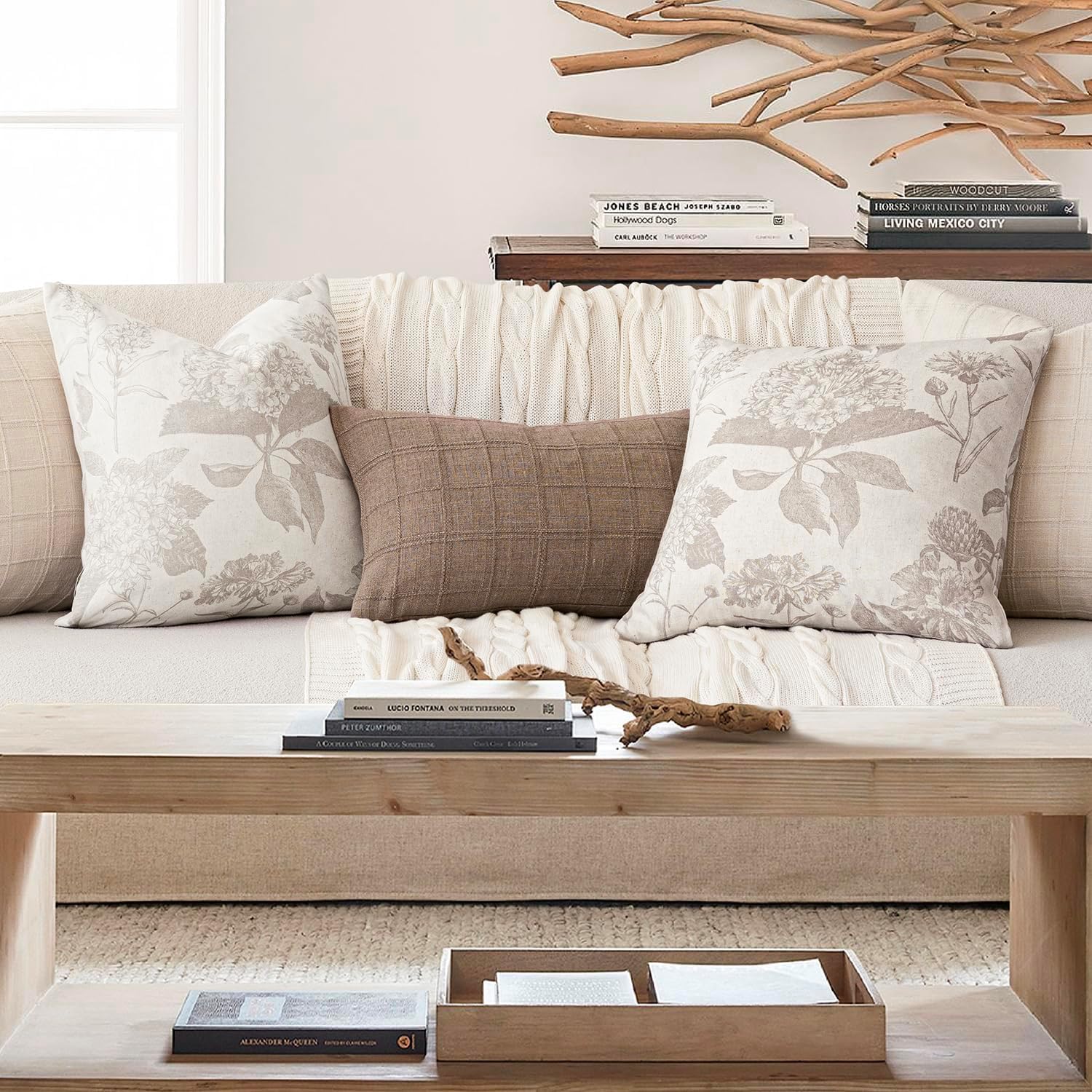 Foindtower Set of 2 Linen Floral Vintage Throw Pillow Covers Neutral Accent Print Decorative Cushion Covers Farmhouse Home Decor for Sofa Chair Couch Bedroom Living Room Outdoor,18×18 Inch,Tan Beige