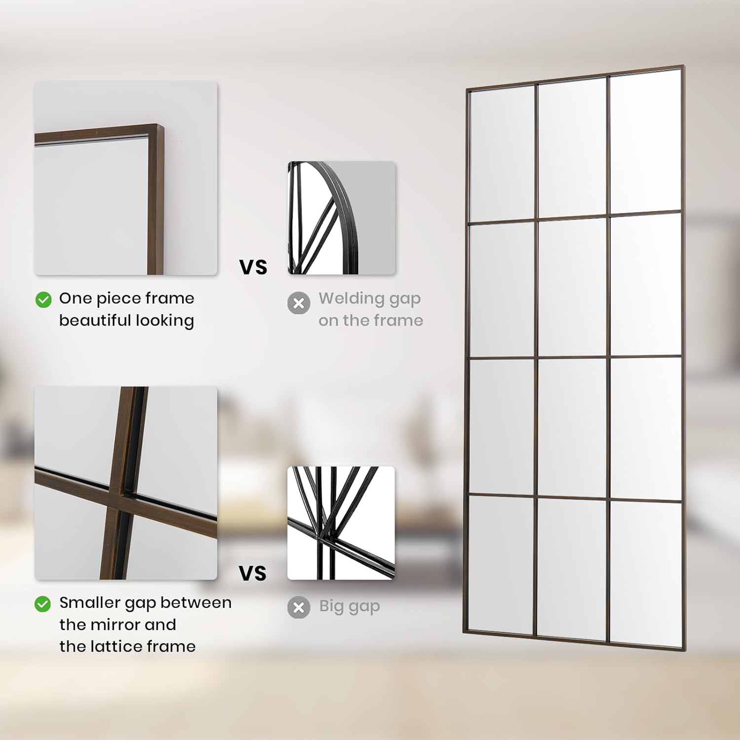 - Gifts For Everyone: This windowpane full length mirror is suitable for everyone you care about. A best gift idea for your mom, wife, partner, deaughter, sister and friend. Package including a full body mirror, installation accessiories and instruction