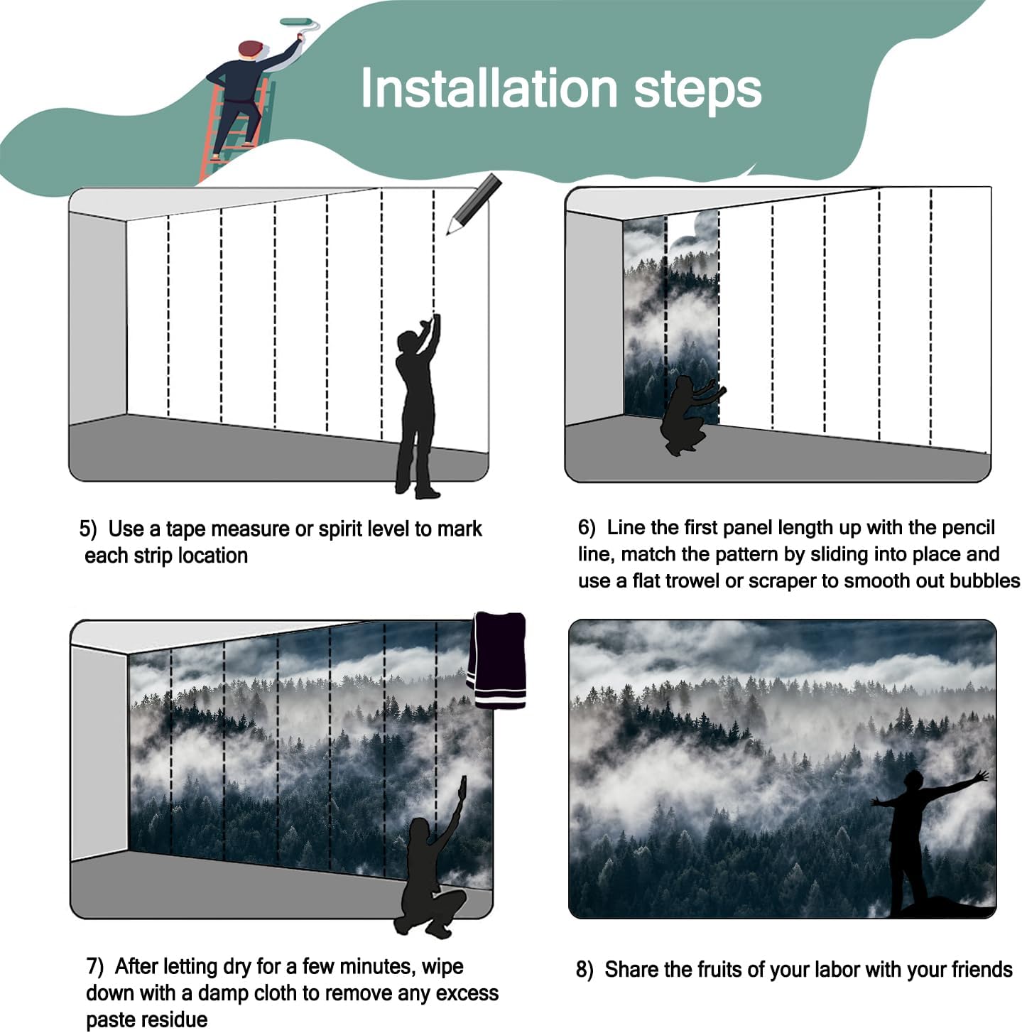- Mural wallpaper size: 140 "W x 91 "H, divided into 7 sections, each section is labeled with a number underneath, there is no need to overlap the pattern when installing, just install according to the number labeled underneath the panel