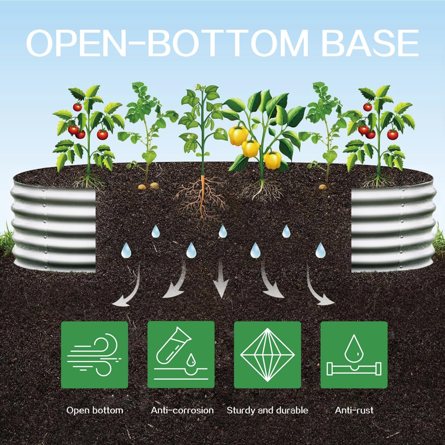 - OPEN BOTTOM DESIGN: Gardmax galvanized planter raised beds are designed with an open bottom, which is good for drainage to protect plants, plant roots won't be sick from excessive water. It also keep weeds away from soil and keep out small pets like chicken, puppies, rabbits to protect your plants.