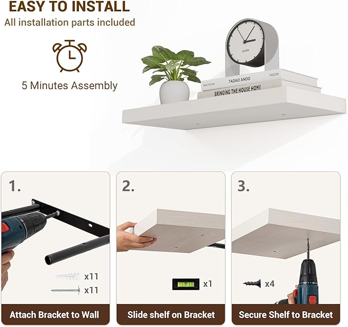 - 【Easy Installation】Designed with user convenience in mind, these shelves come with all necessary mounting hardware and clear instructions. You can have them up and ready to use in less than 5 minutes. Plus, our customer service is always ready to assist with any queries or concerns, ensuring a hassle-free experience