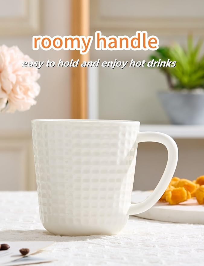 Ceramic Coffee Mugs 15 oz, Large Waffle Embossed Mug Set, Coffee Cups for Latte, Cappuccino, Cocoa, Tea, Mocha, Milk, Housewarming Wedding Present,Microwave & Dishwasher Safe - Set of 4 (White)