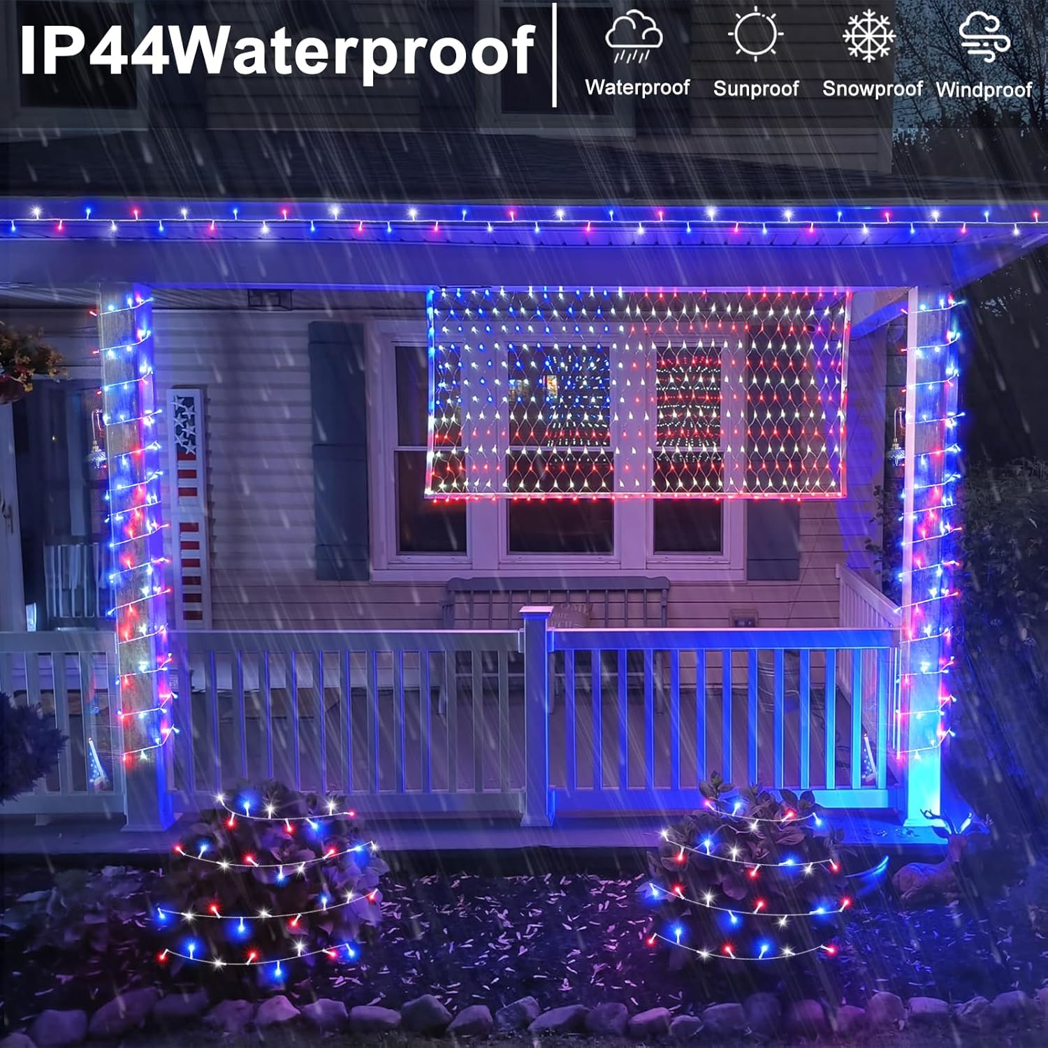 - Red White and Blue Lights: The patriotic lights design with IP44 outdoor waterproof, can withstand wind, snow, rain and extreme weather. 4th of July lights are equipped with a UL certified 29V low-voltage plug ensures the safety. It's safe for family with kids or pets!