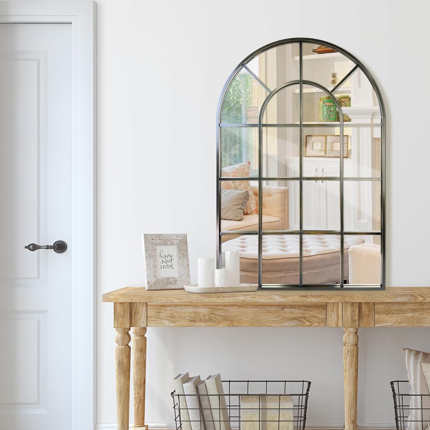 Arched Windowpane Wall Mirror 24"x36" Bronze Wall Mounted Art Pane Mirror Farmhouse Decorative Mirror Leaning Hanging Wall Mirror for Bedroom Living Room Entrance Hallway Wall Decor