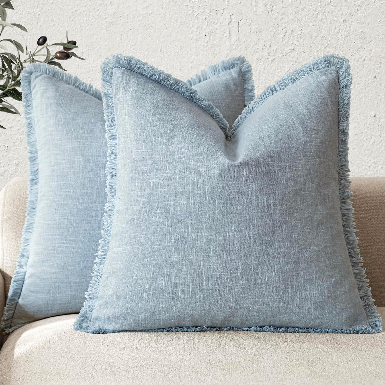 Foindtower Set of 2 Decorative Linen Fringe Throw Pillow Covers Boho Farmhouse Cushion Cover with Tassels Soft Accent Pillowcase for Couch Chair Sofa Bed Living Room Home Decor,18×18 Inch,Sky Blue