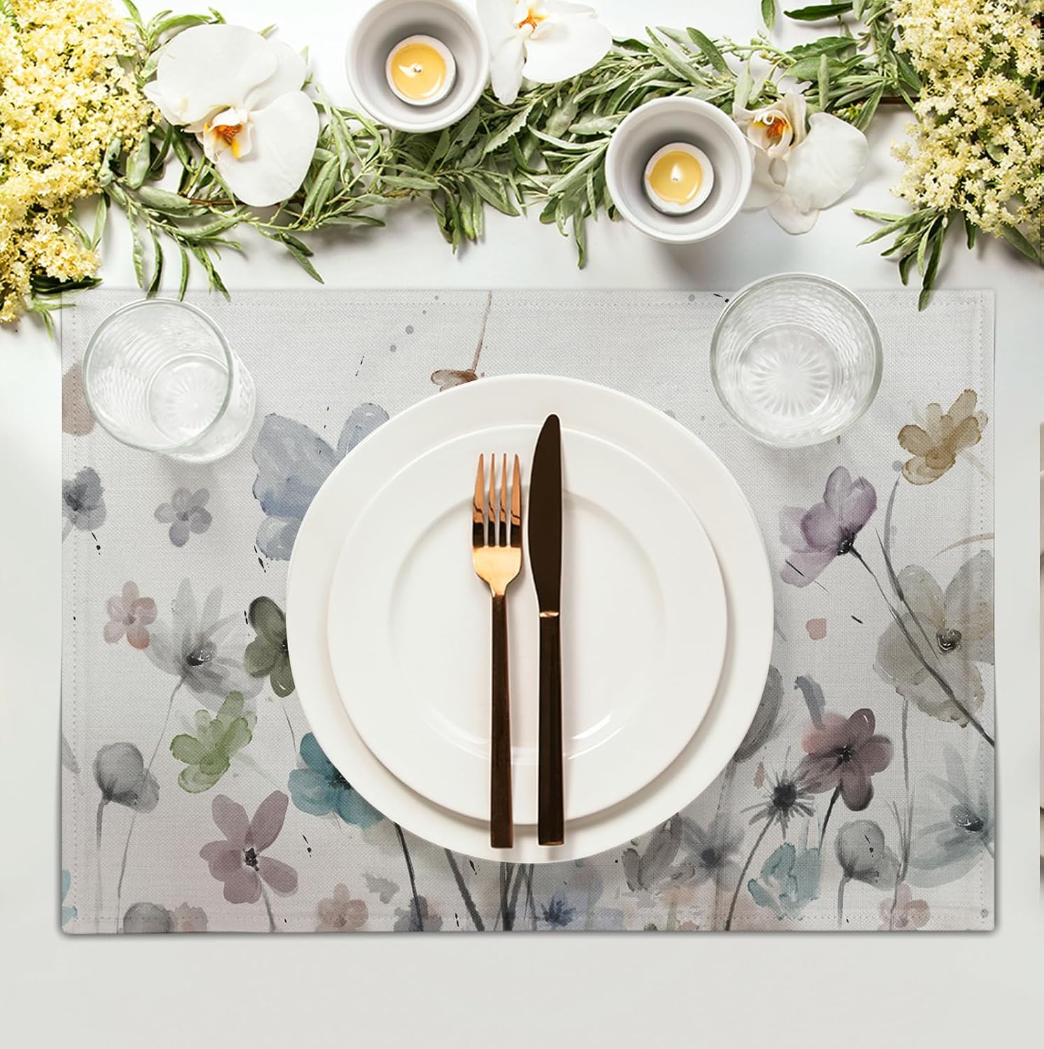 - TABLE DECORATION: Watercolor floral table place mats feature high-definition printing technology for crisp, clear patterns and vibrant colors; rectangle placemats with a beautiful flowers pattern; unique and eye-catching seasonal patterns add charm to purple flower place mat, creating a spring and summer atmosphere for your party