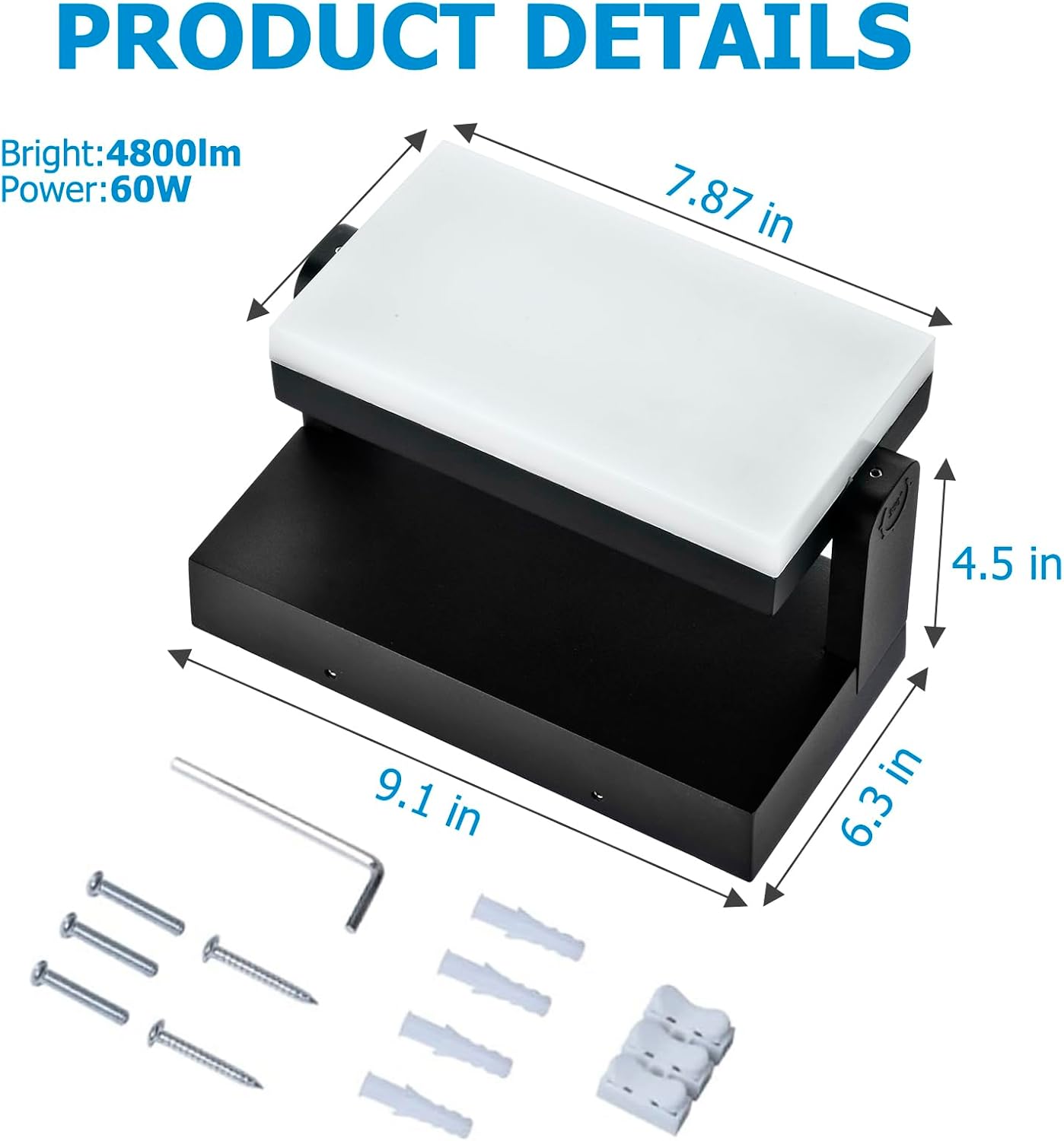 - Super Bright & Anti-glare: wall pack light Bright up to 4800lm but not dazzling! the outdoor wall lighting provide excellent illumination for any space, Equipped with 105 high-end LED lamp beads .the 4800LM/60W outdoor security lights can cover a lighting area of 3500 sq.ft. This wall flood light is very modern and stylish, and can decorate your house in all directions.