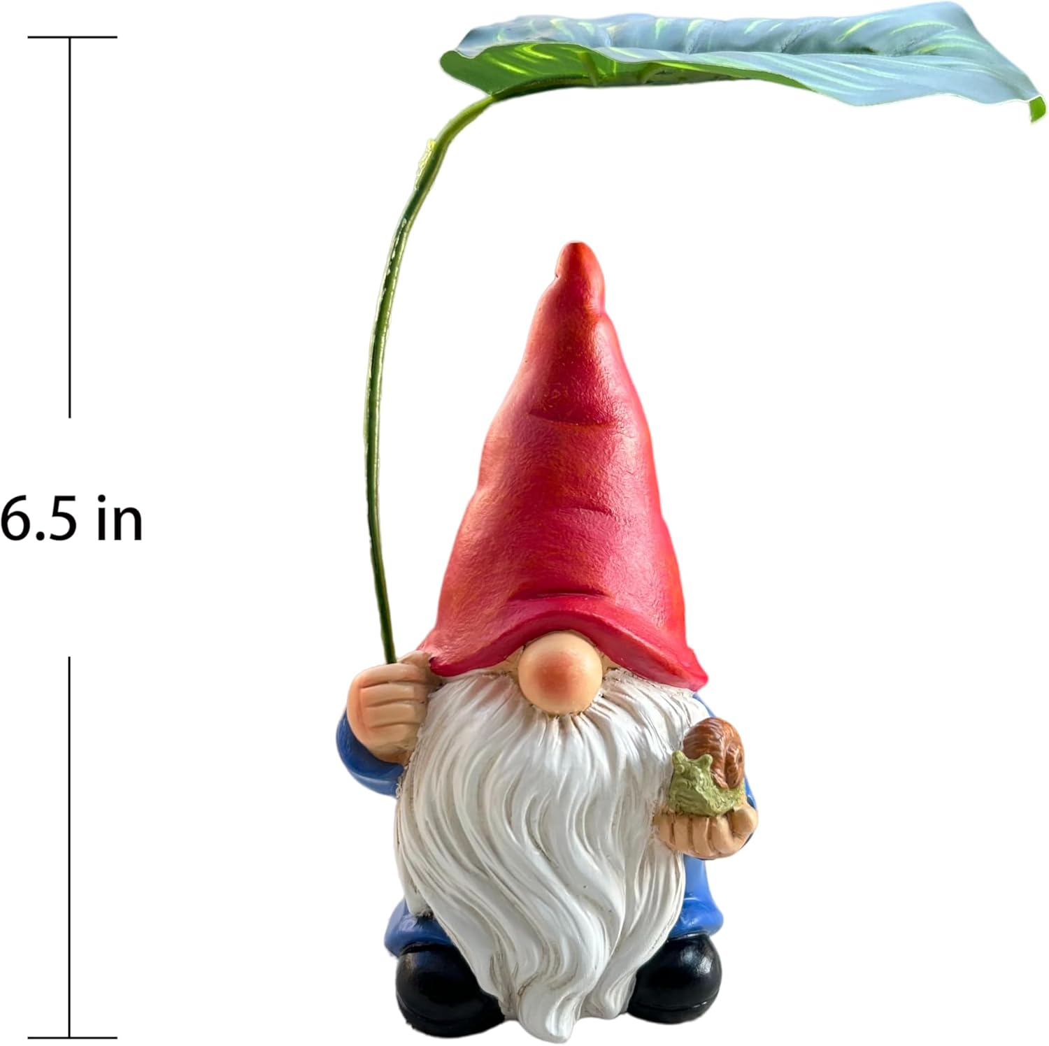 - CHARMING DESIGN: Adorable garden gnome figurine featuring a red pointy hat, flowing white beard, and blue outfit while holding a leaf umbrella