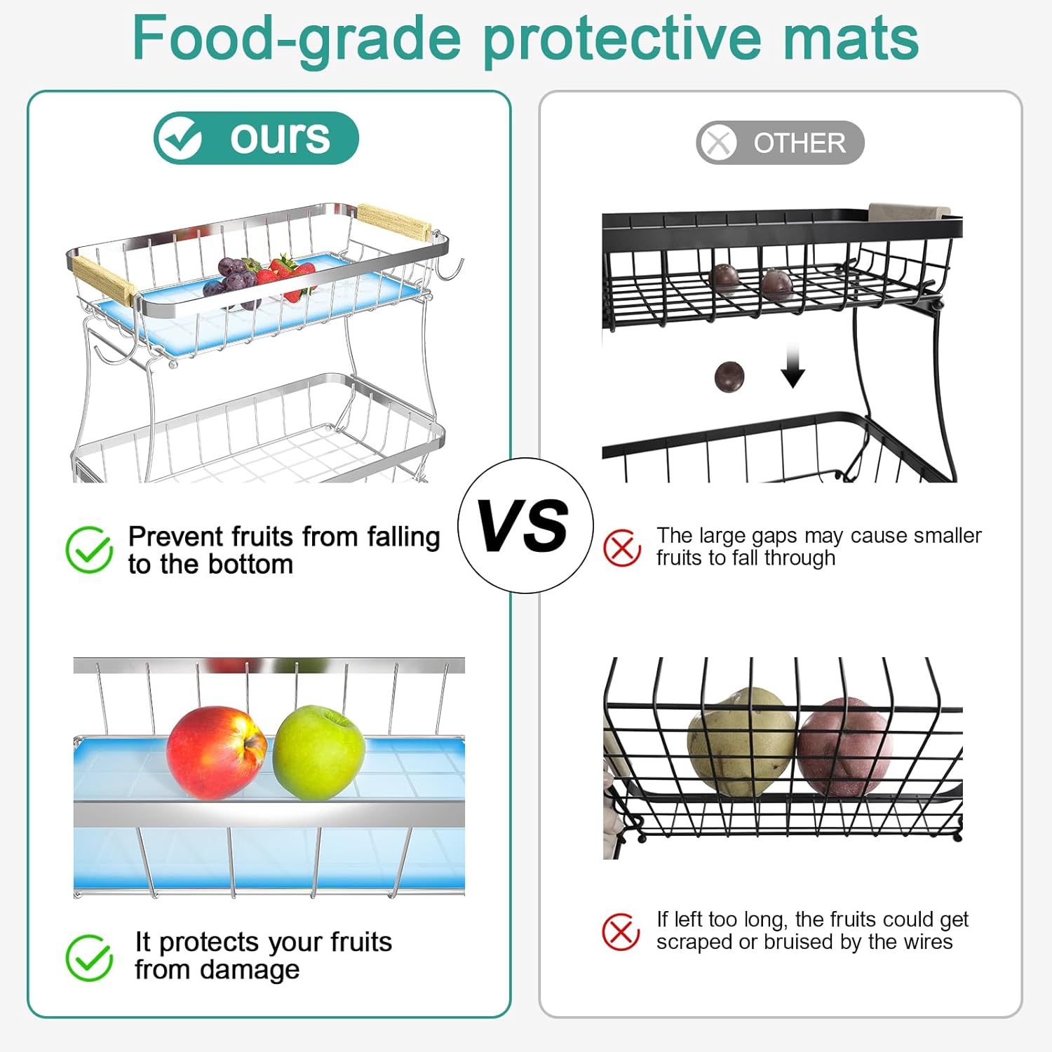 - Bonus mats prevent fruit from falling and protect against metal pressure marks.