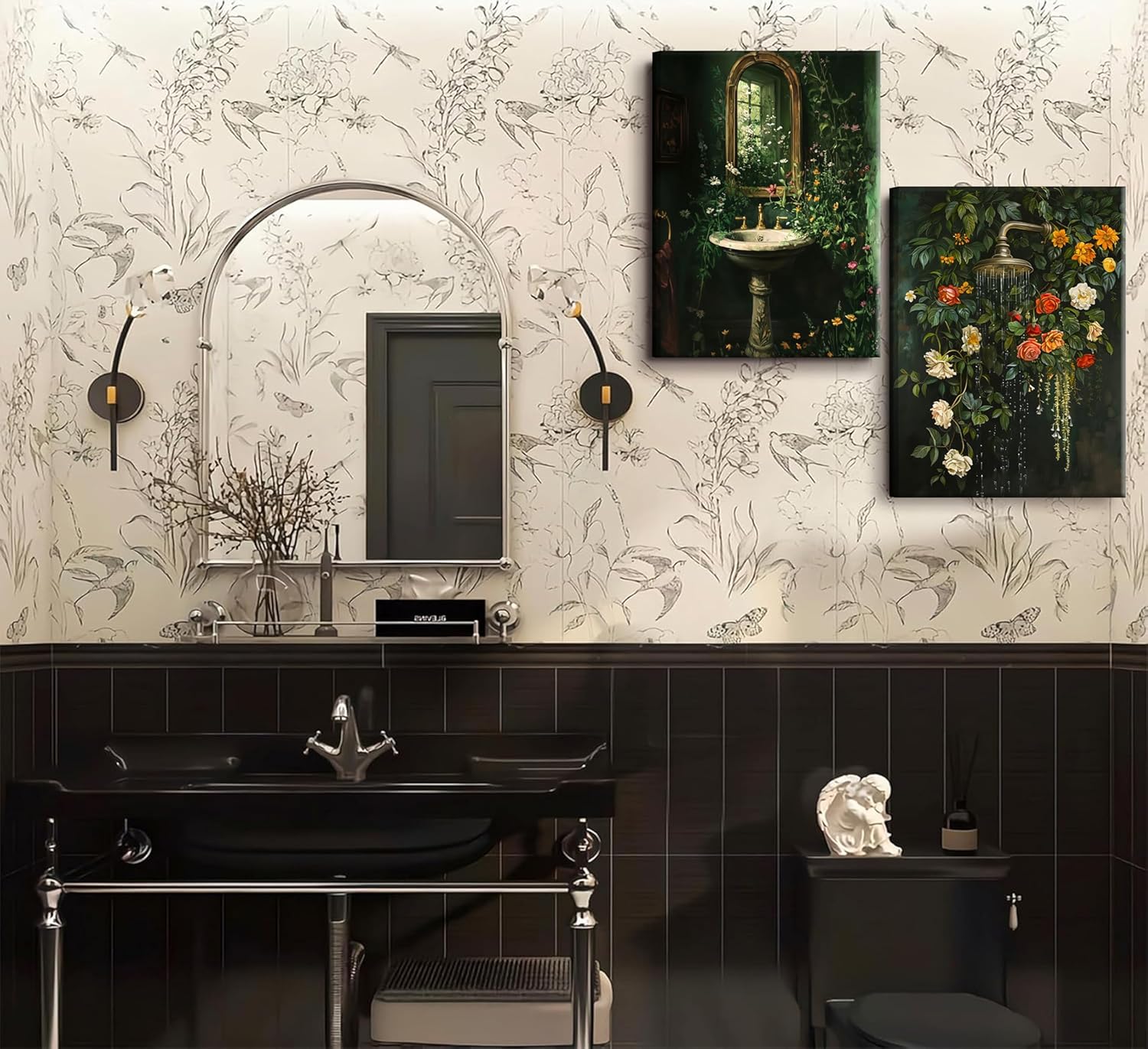 3Pcs Framed Vintage Dark Green Bathroom Wall Art Shower Toilet Paper Roll Floral Poster Print Modern Farmhouse plants Painting Picture Wall Decor For Bathroom Living Room Decoration