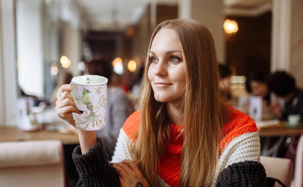 Lightahead Elegant Bone China Two Coffee Mugs Set in Bird Design 10.8 oz Each Cup in Attractive Gift Box
