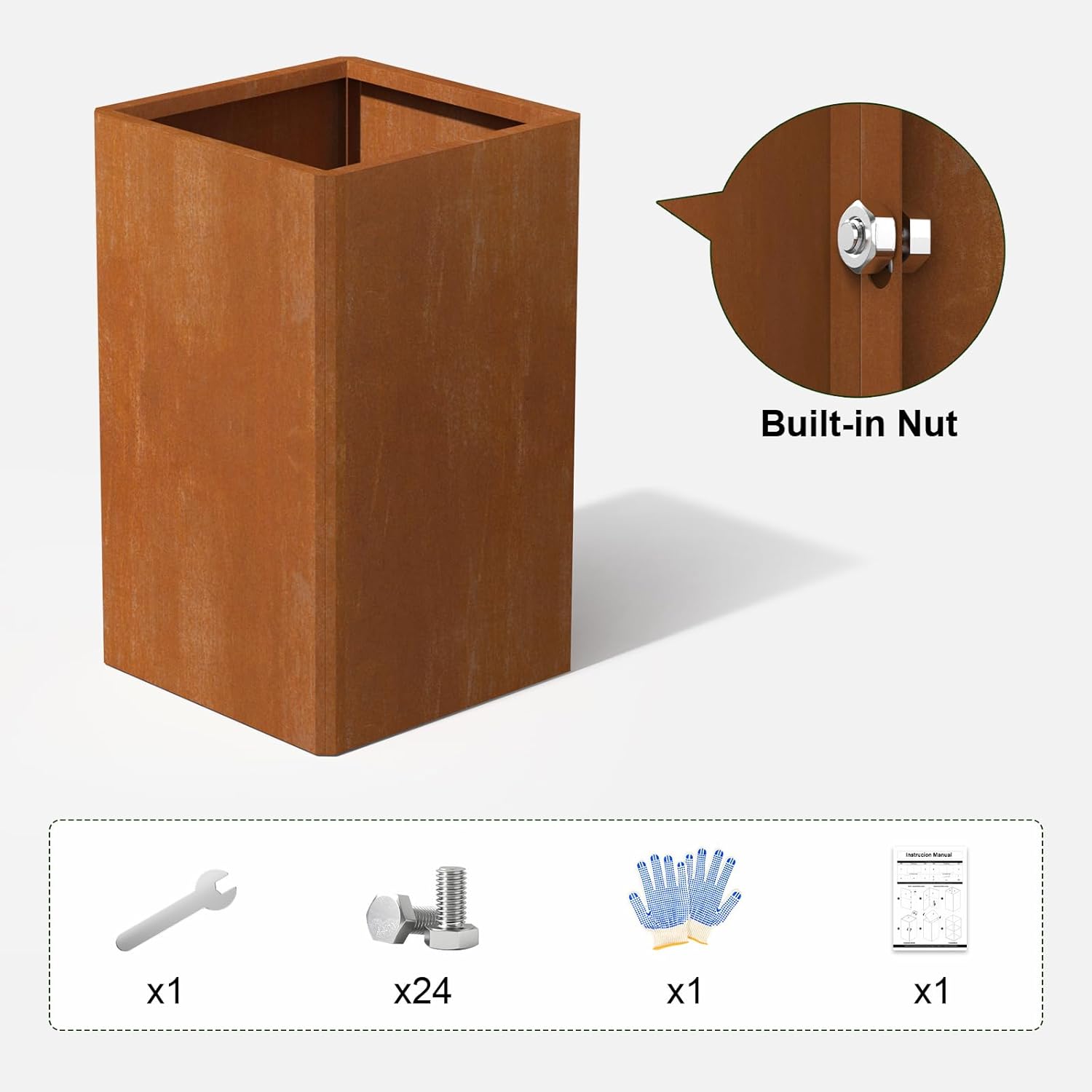 - Size and accessories: The metal square tall planter is equipped with 24 screws, a wrench, protective gloves and instructions. Note: This large metal outdoor planter needs to be assembled