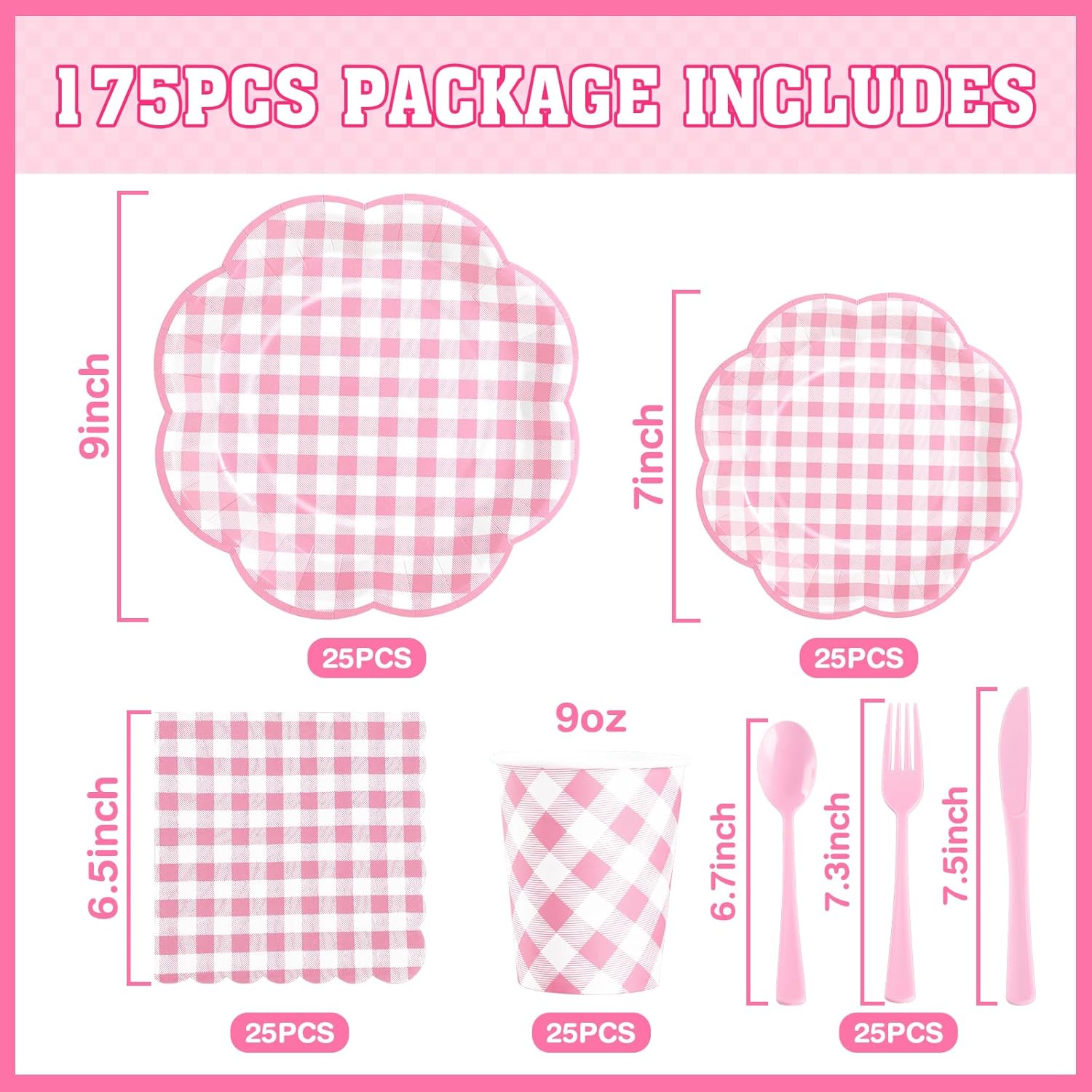 - 【Serves 25 Guests】Pink gingham plates sets includes 25pcs 9-inch pink checkered dinner plates, 25pcs 7-inch pink plaid dessert plates, 25pcs 9 oz gingham cups, 25pcs 6.5-inch scalloped gingham napkins and 25 sets of knives, forks, spoons for a total of 175 pieces. Perfect for all kinds of parties and celebrations
