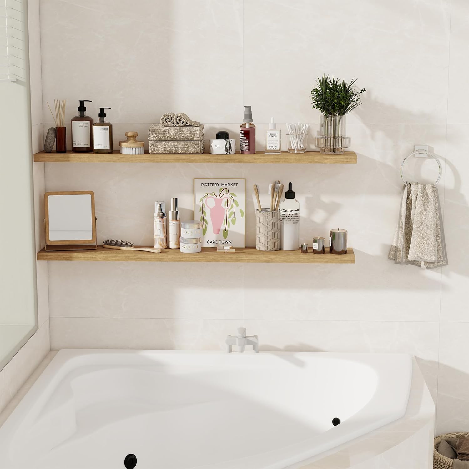 Fun Memories 48 Inch Floating Shelves for Wall, Set of 2 – Rustic Wood Wall-Mounted Shelves with Invisible Brackets for Bedroom, Bathroom, Kitchen – Storage, Books, or Decor, Oak