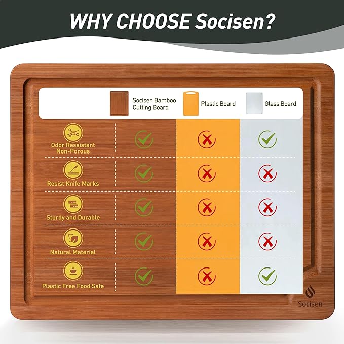- Knife-Safe Surface for Edge Preservation: Our bamboo cutting board features a durable and thick surface. Meticulously polished to be ultra-smooth and flat, it has no burrs, cracks, or splinters. The bamboo cutting board is gentle on knives, reducing dulling and blade damage. Whether using a serrated knife for bread or a chef's knife for vegetables, the wood cutting board prevents blades from dulling quickly, saving you time on sharpening and allowing more time for enjoying your cooking.