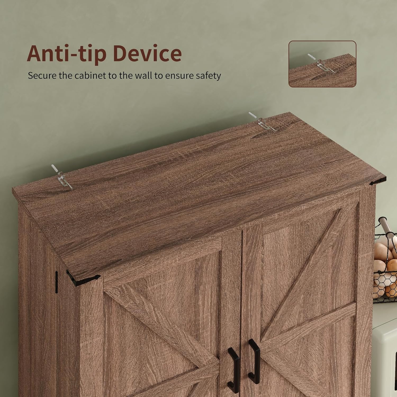 - Stable Pantry: Extracted from P2 MDF, each door comes with 2 hinges to ensure smooth operation and overall stability. Magnetic door locks make opening and closing the door easier; We have prepared anti-tipping accessories for you to fix the kitchen storage cabinet on the wall to avoid the cabinet from shaking and tilting; The waterproof surface makes the pantry to withstand moisture and steam, it is also suitable for bathroom, laundry room