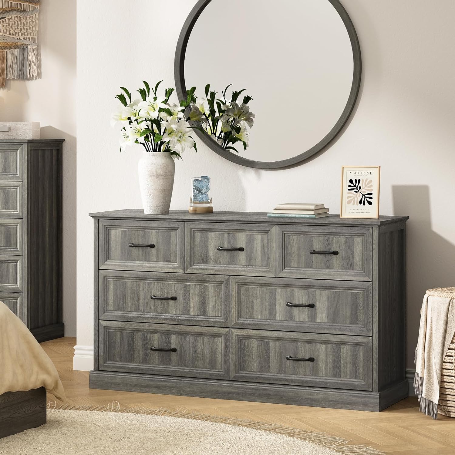 - Versatile Usage: This grey dresser offers various placement options for your room. Beyond being a storage cabinet in the bedroom, it serves as a entryway dresser to put daily items and overflow, or even as a TV stand(suit for 60" TV) in the living room for odds and ends. The classic farmhouse dressers are suitable for most spaces and styles of homes, can be integrated into different scenes, such as bedroom, living room, closets, hallway, and entryway etc. The farmhouse dresser with drawers can fit them perfectly.